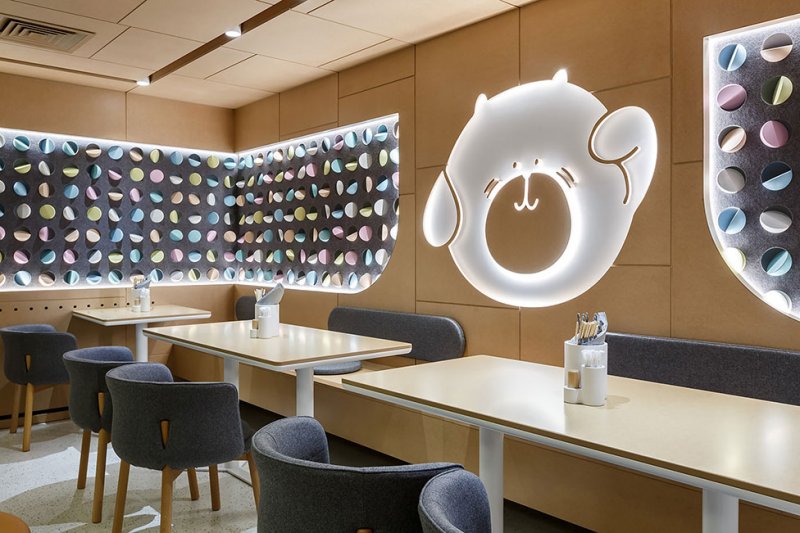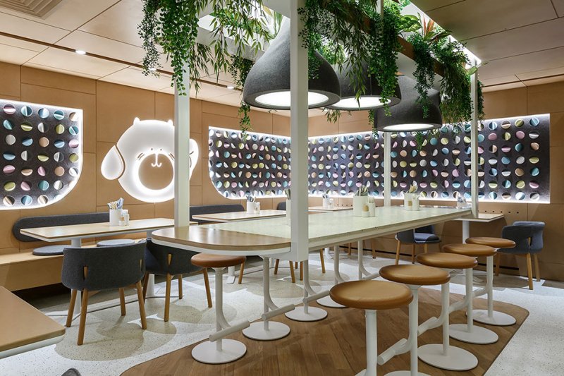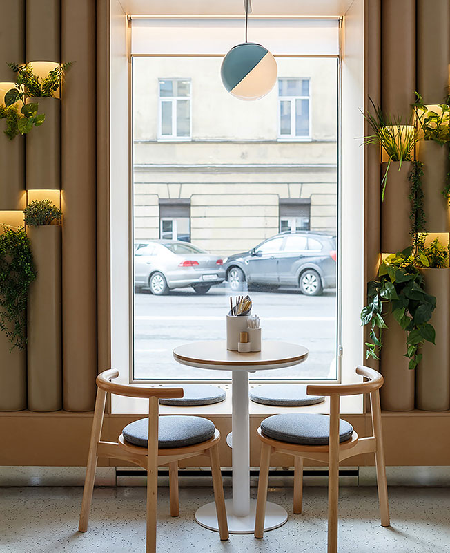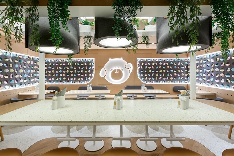 В оформлении стен дизайнер использовал гильзовый картон, который напоминает стволы бамбука и отсылает к культуре Китая, Японии и Таиланда. С этой отделкой соседствуют светлые полы и столешницы с терраццо, стулья и светильники округлых форм, по мнению автора проекта, напоминающие пельмени — также популярное блюдо азиатской кухни.