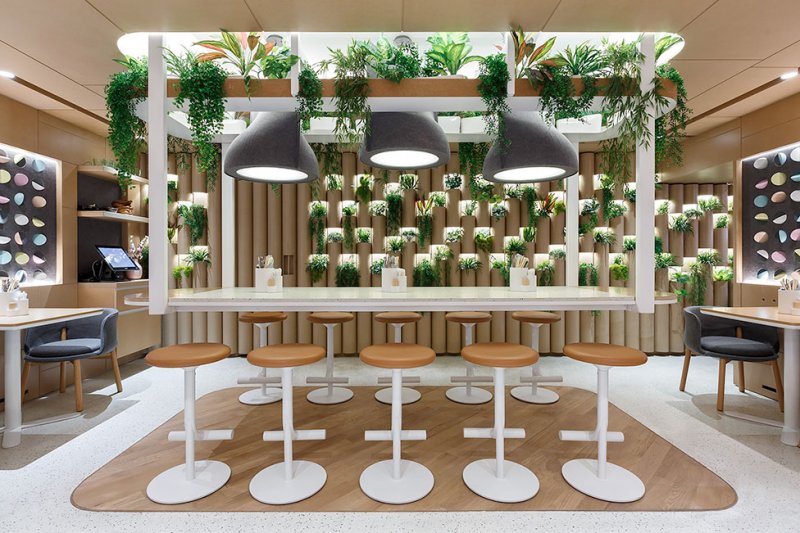 Интерьер кафе Bao Mochi в Санкт-Петербурге — работа Марата Мазура. Дизайнер соединил азиатские мотивы, террацо и живые растения.