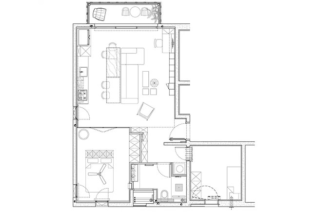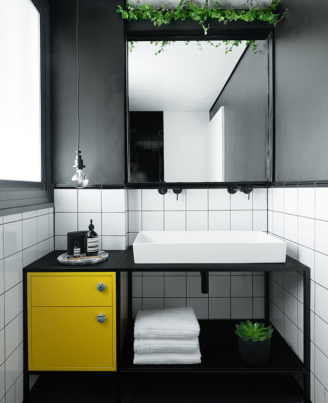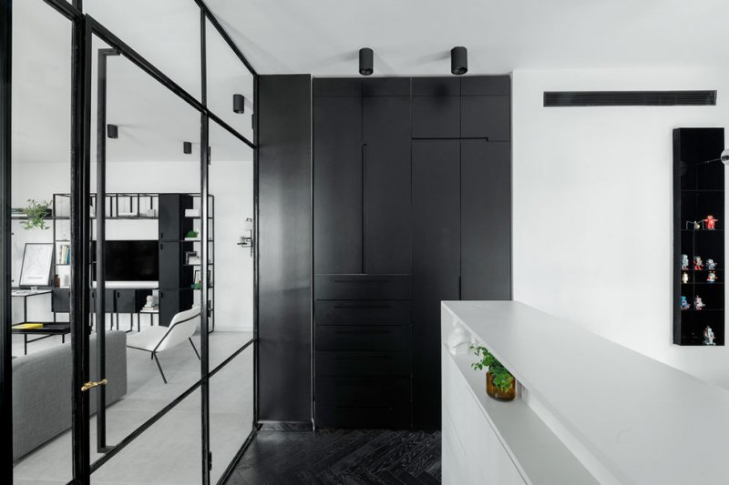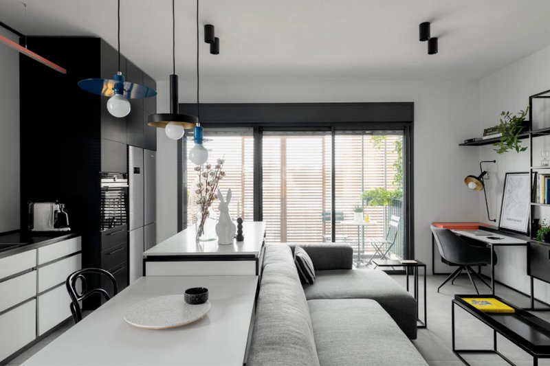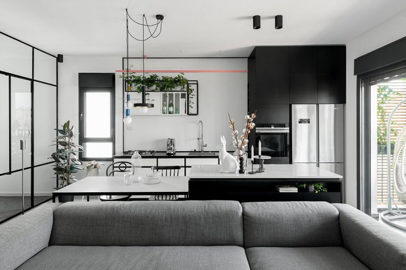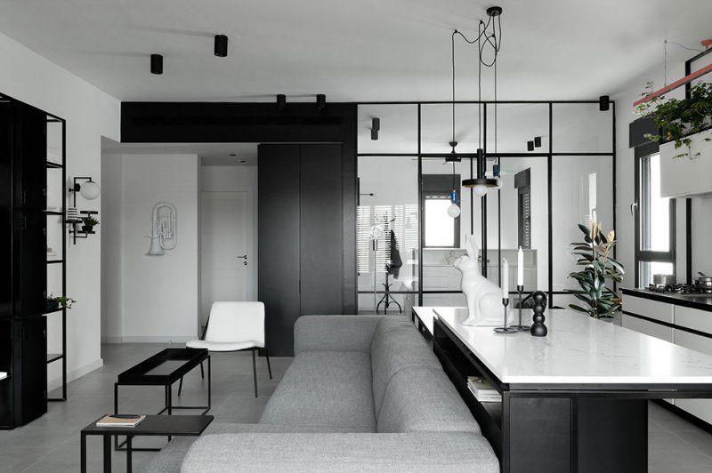 «Пока другие ищут повсюду приватности, они хотели быть на виду», — говорит о хозяевах квартиры в Яффе дизайнер Эйтан Коэн, Studio ETN. Пара искала жилье, где «свобода была бы безгранична». Максимально открытое, светлое пространство с выраженной геометрией, которое предоставляло бы каждый день опыт «отельного» проживания. Дизайнеры Studio ETN создали на площади 78 кв. метров открытый интерьер, различные зоны которого зрительно связаны друг с другом и гармонично работают вместе. В лаконичную палитру включили черный, белый и серый цвета с редкими пастельно-розовыми деталями. В квартире отказались от сплошной стены между гостиной и спальней, на которой изначально должен был быть установлен кухонный гарнитур. Ее заменила прозрачная перегородка на черном металлическом профиле, благодаря которой спальня визуально продолжает общее пространство кухни-гостиной. Кровать расположена в центре комнаты, словно остров. Немного приватности ей добавляет тумба, служащая изголовьем. Мебель в общественной зоне выстроена рядами, чтобы добавить геометрии и облегчить передвижение: письменный стол и стеллаж, вытянутый диван с креслом, кухонный гарнитур формируют строгие линии. Все системы хранения расположились вдоль стен, от пола до потолка, чтобы они рассматривались как часть архитектуры. Системы освещения — индивидуальные для каждого помещения в соответствии с его характером. При перепланировке ванная комната выросла в размере за счет подсобного помещения с огромным окном. В нише в коридоре нашлось место для бытовой техники: стиральной машины и сушилки.