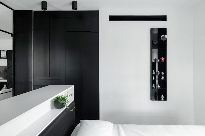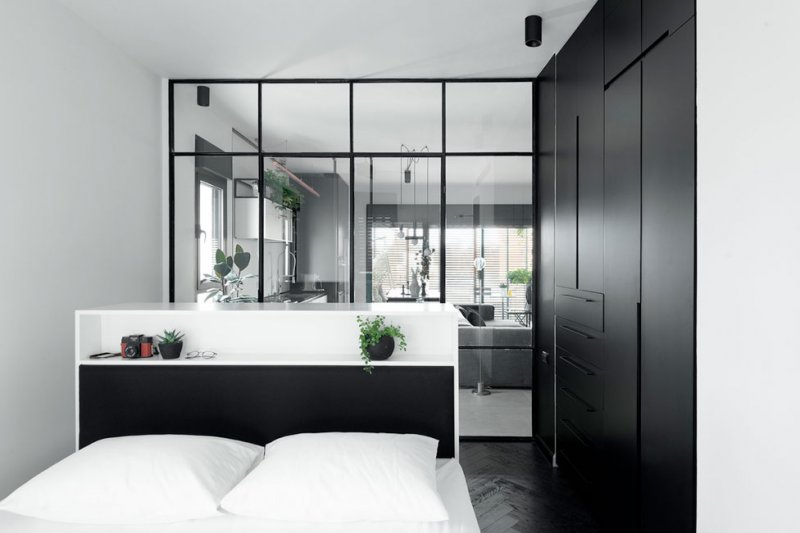 В квартире отказались от сплошной стены между гостиной и спальней, на которой изначально должен был быть установлен кухонный гарнитур. Ее заменила прозрачная перегородка на черном металлическом профиле, благодаря которой спальня визуально продолжает общее пространство кухни-гостиной. Кровать расположена в центре комнаты, словно остров. Немного приватности ей добавляет тумба, служащая изголовьем.