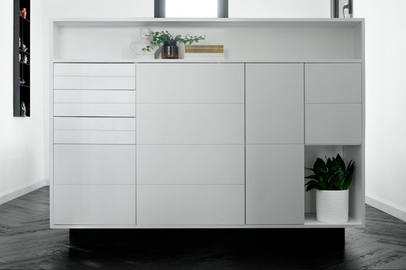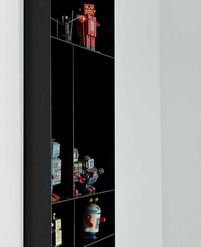 Мебель в общественной зоне выстроена рядами, чтобы добавить геометрии и облегчить передвижение: письменный стол и стеллаж, вытянутый диван с креслом, кухонный гарнитур формируют строгие линии. Все системы хранения расположились вдоль стен, от пола до потолка, чтобы они рассматривались как часть архитектуры. Системы освещения — индивидуальные для каждого помещения в соответствии с его характером.