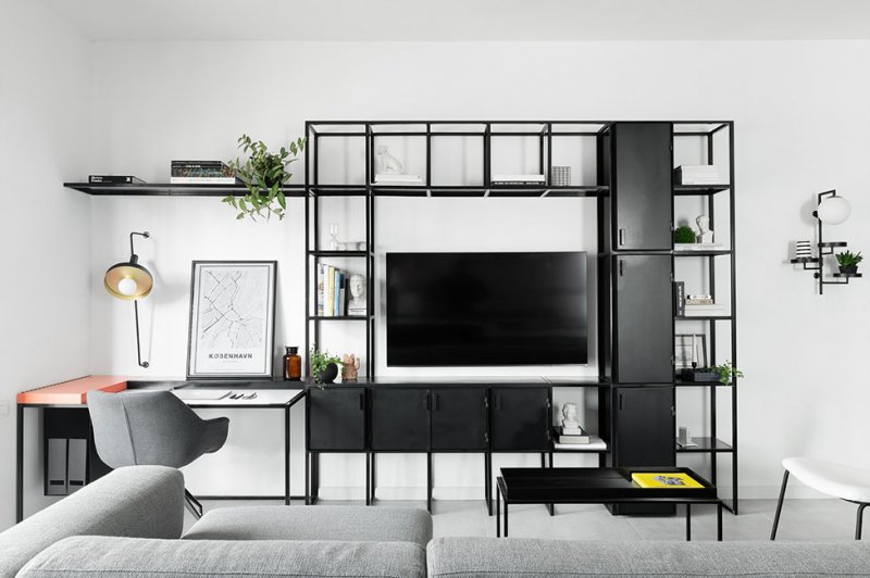Дизайнеры Studio ETN создали на площади 78 кв. метров открытый интерьер, различные зоны которого зрительно связаны друг с другом и гармонично работают вместе. В лаконичную палитру включили черный, белый и серый цвета с редкими пастельно-розовыми деталями.