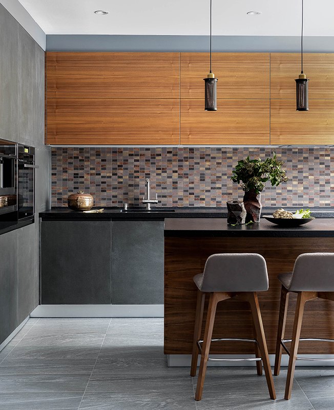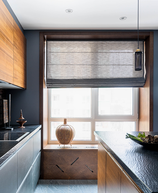 В приоритете были натуральные материалы: древесина, камень, керамика. Практически во всех комнатах присутствует отделка шпоном дуба, которая «собирает» интерьер: это и оконные откосы, и решетки, закрывающие встроенные в подоконную часть радиаторы отопления в кухне-гостиной. По мнению Анастасии, отделка древесиной добавляет благородства, выглядит тепло и уютно.