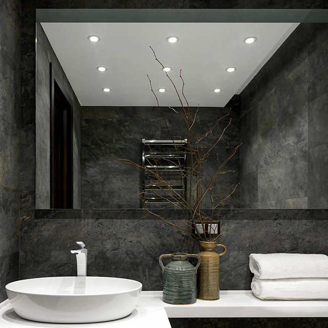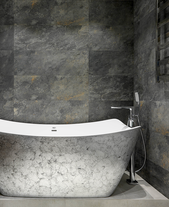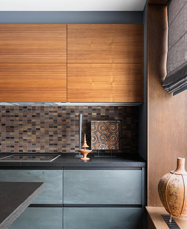 «Люблю использовать текстурные материалы. Всю зону прихожей и гостиной мы оформили декоративной штукатуркой. Продолжили эту идею на фасадах кухни. Они керамические, с хаотичной натуральной текстурой. И мне, и клиенту нравятся брутальные поверхности материалов — и здесь мы сошлись». В санузлах применили керамогранит под мрамор и под камень. Вся корпусная мебель и часть столярных изделий были выполнены на заказ по эскизам дизайн-студии Анастасии Ковальчук. Также использовали мебель Alberta Salotti, Alf DaFre.