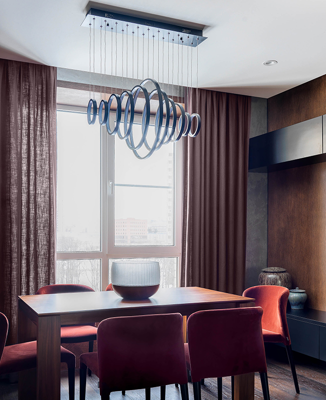 Зона столовой. Обеденный стол и стулья, Alf DaFre. Подвесной светильник, SWG.