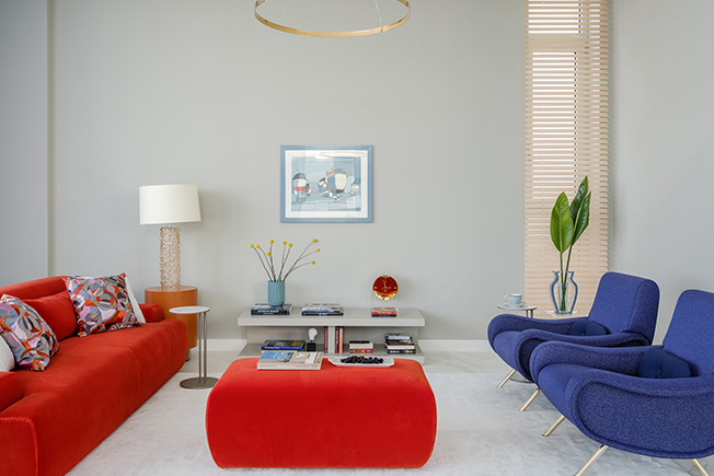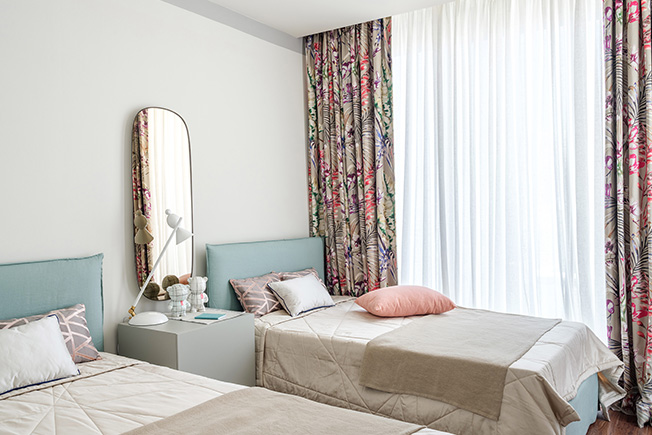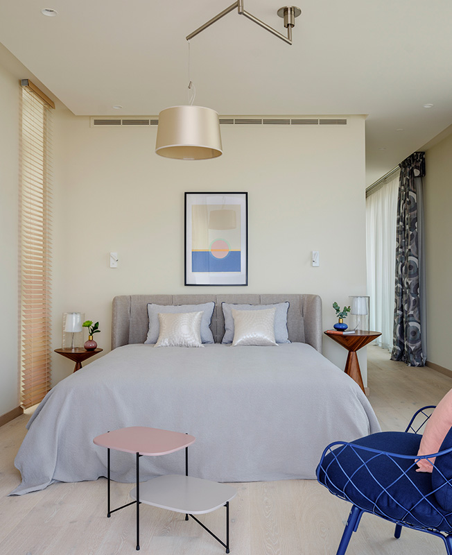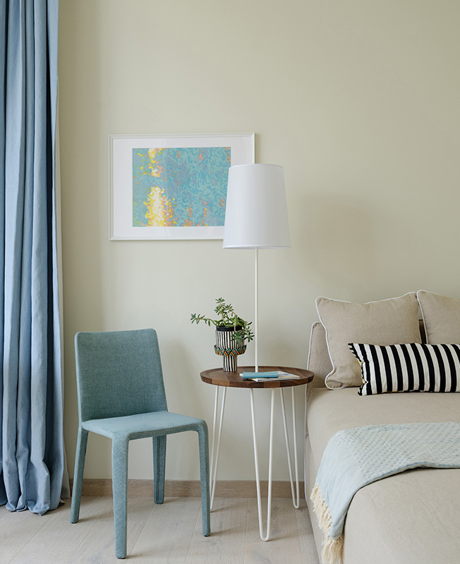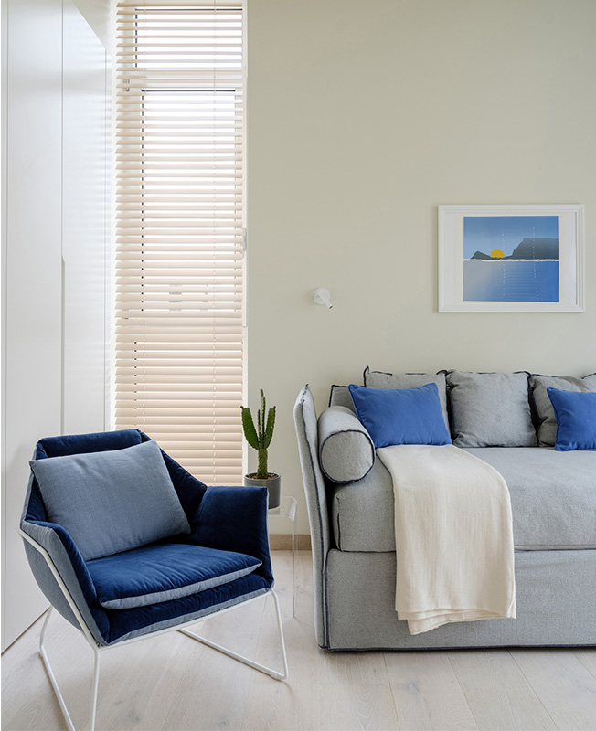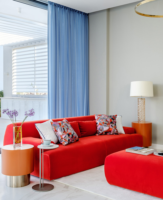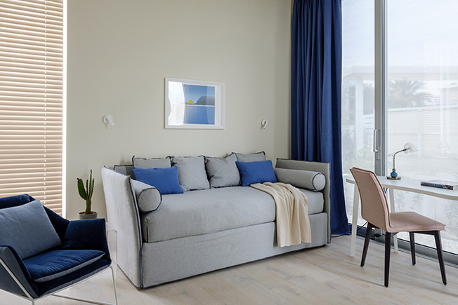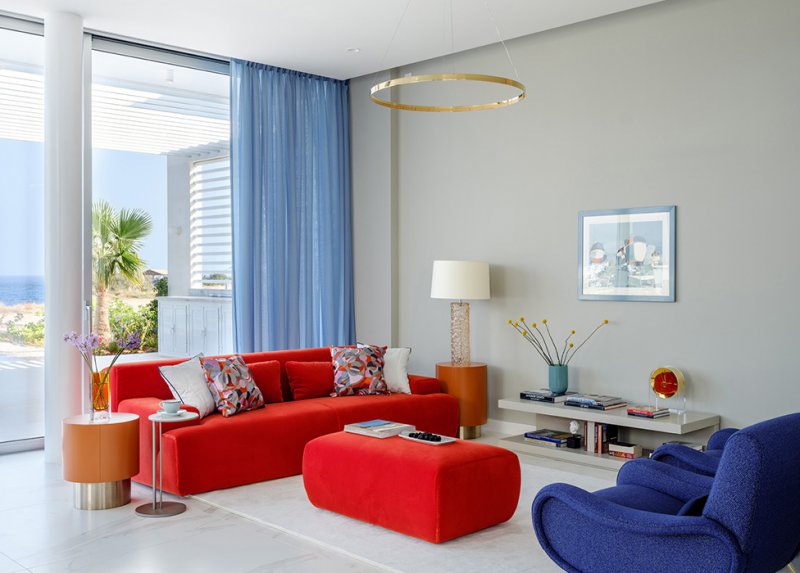 «Цветовая палитра для меня была связана с плотным воздухом Кипра, ярким солнцем и морем, которое видно из окна, — рассказывает Елена Учаева. — Поэтому в интерьере много оттенков моря: освежающего и прохладного голубого, бодрящего синего, а также цвета песка. Самый яркий акцент — терракотово-красный диван в гостиной.