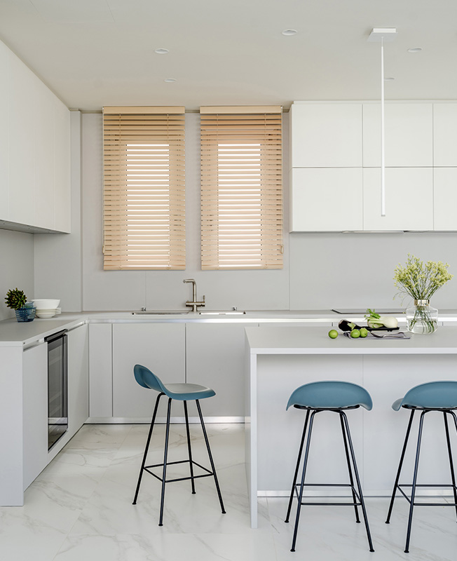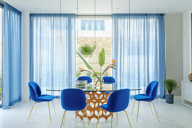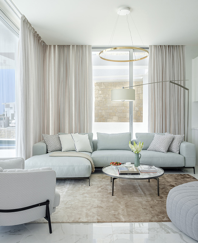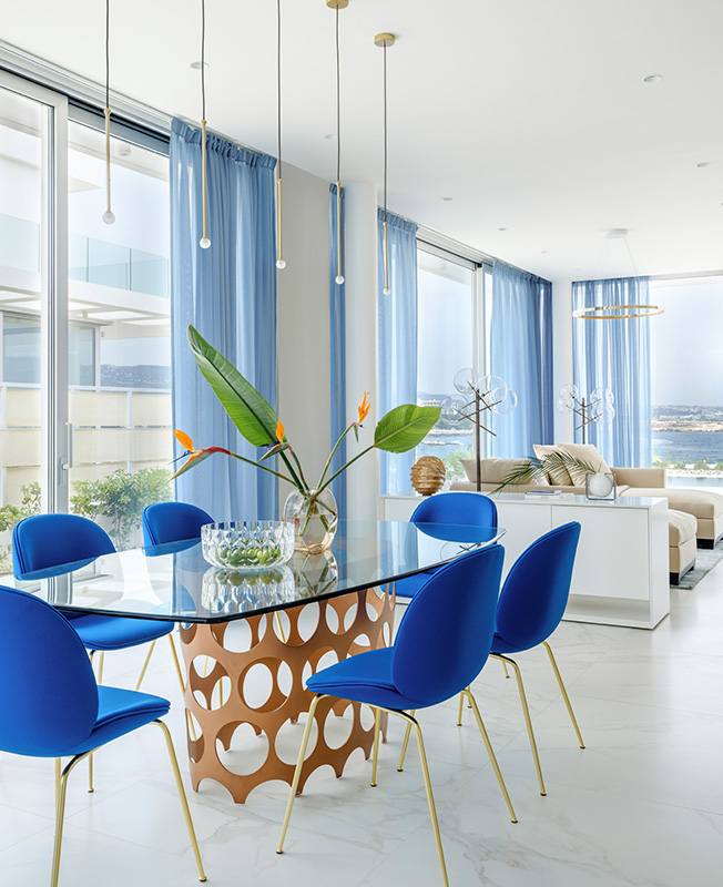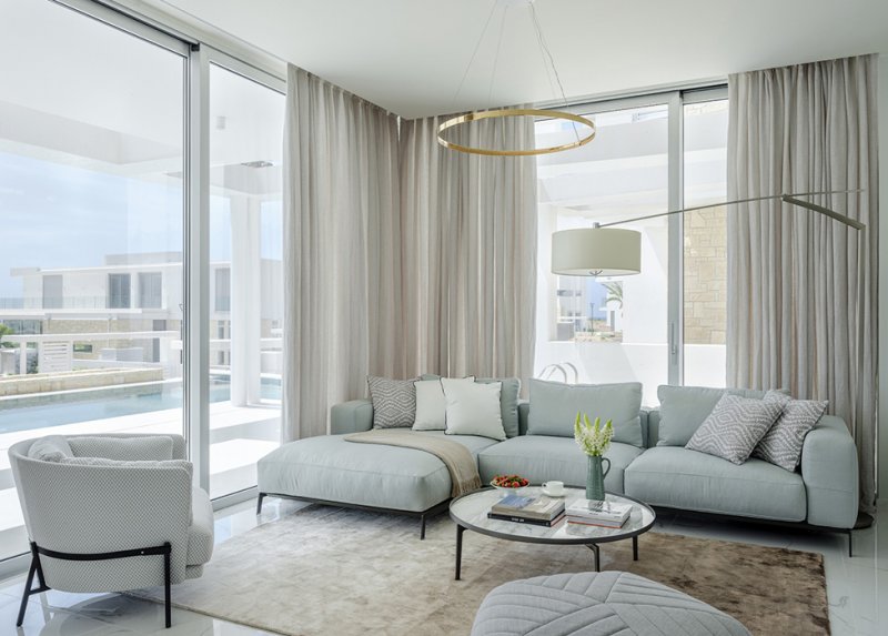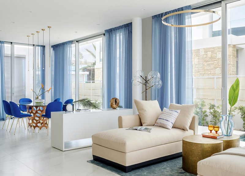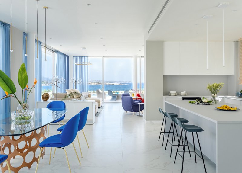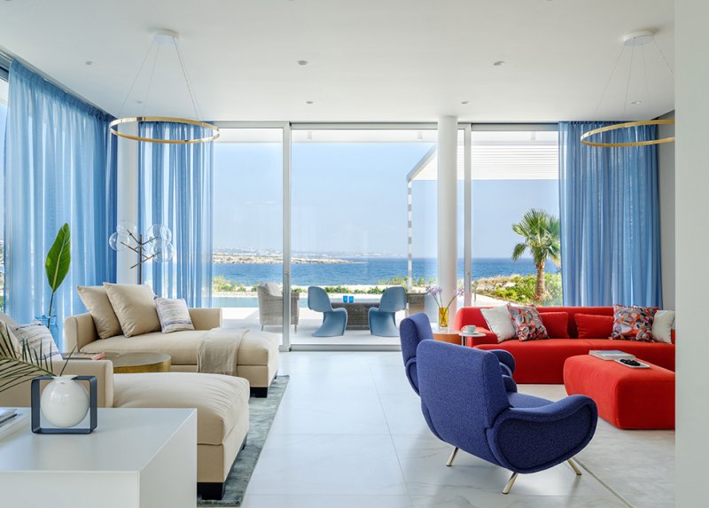 Заказчики — русская семейная пара с двумя детьми, планировали несколько месяцев в году жить на Кипре. Хозяин — ресторатор, давно влюблен в этот средиземноморский остров. Они хотели спокойный, но при этом нарядный и нетипичный для Кипра интерьер. Яркие акценты были одним из условий.
