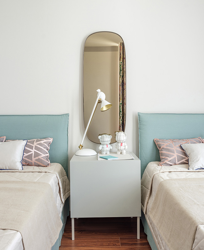 «Мне хотелось, чтобы основная часть мебели выглядела легкой. Стеклянный стол Porada, несмотря на то что достаточно большой, растворяется в пространстве благодаря стеклянному топу, видно только его необычное подстолье. Вокруг стола — обеденные стулья Gubi на тончайших блестящих ножках. Мои любимые кресла Cassina в обивке цвета вечернего моря тоже смотрятся легко и приглашают к отдыху. Прозрачные шторы пропускают свет, а от солнца защищают автоматические жалюзи». Массивными, основательными выглядят, как и положено, диваны: от бренда Meridiani в большой гостиной и от Flexform — в малой.
