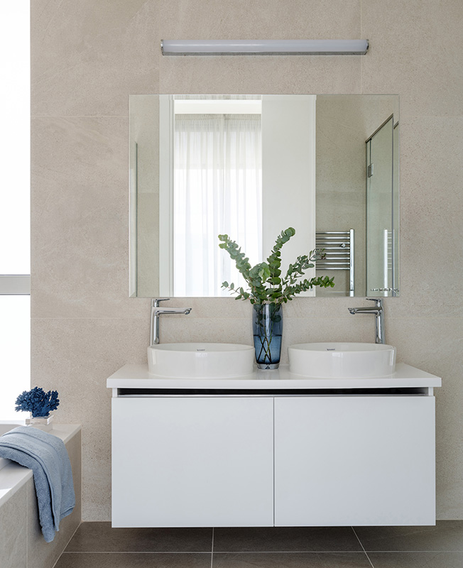 На полу в общественных зонах уложен керамогранит. Он поддерживает прохладу летом, а зимой, когда на Кипре довольно холодно и ветрено, хозяева включают «теплый пол». Интегрированная система «Умный дом» управляет вентиляцией, кондиционированием, светом, жалюзи и шторами на электроприводе.