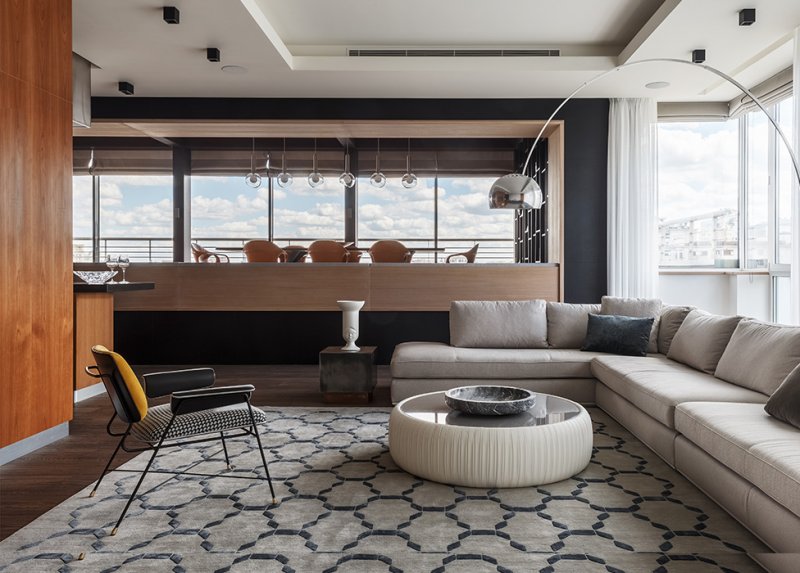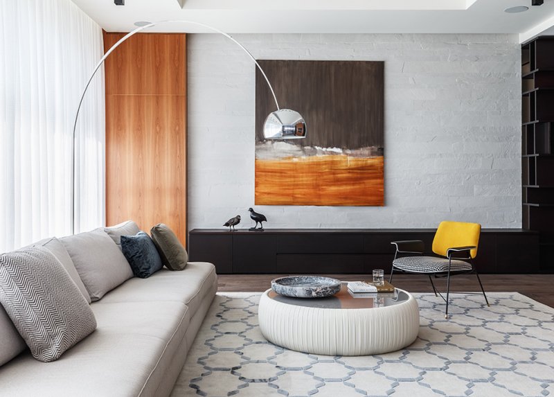 Знаковые предметы в интерьере — кресло Bauhaus дизайна Draga & Aurel, Baxter, и светильник Arco Акилле Кастильони, Flos. У дивана Ditre столик-пуф Tonin Casa. Тумба Cattelan Italia. В отделке стены декоративная штукатурка сочетается с деревом.