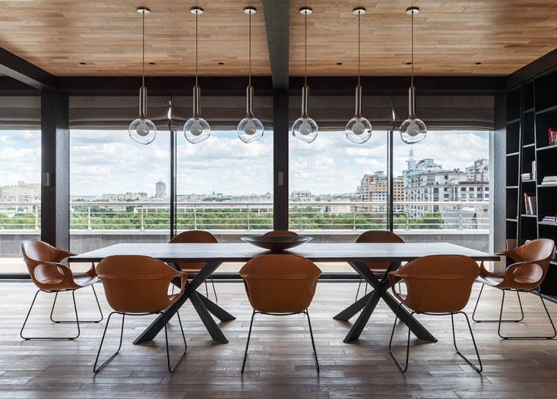 Стол изготовлен на заказ фабрикой Cattelan Italia. Стулья Kristalia. Светильники Estiluz.