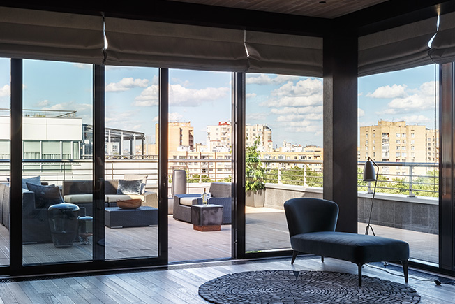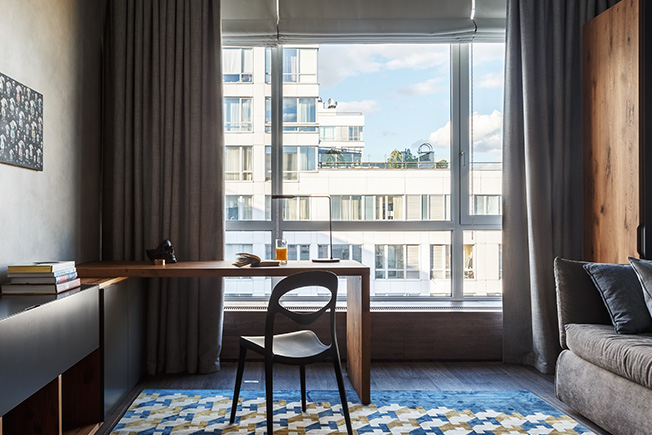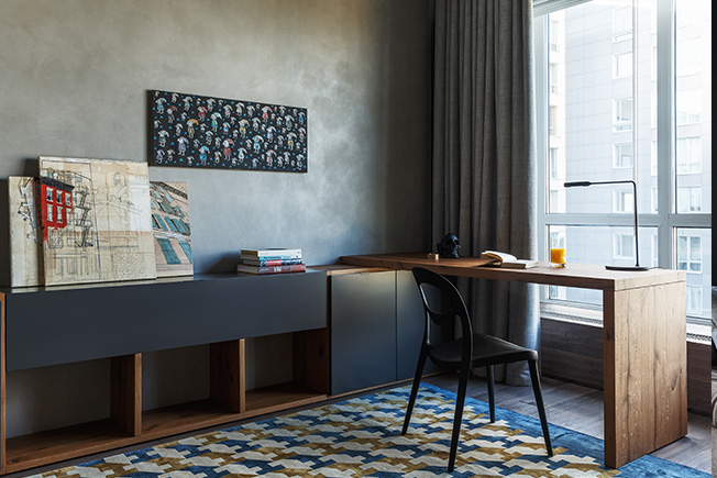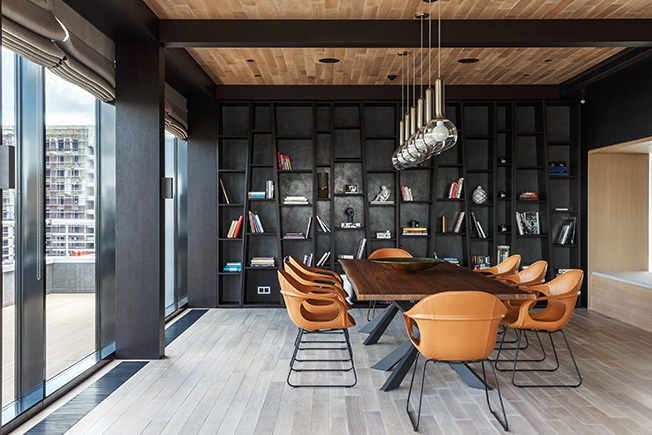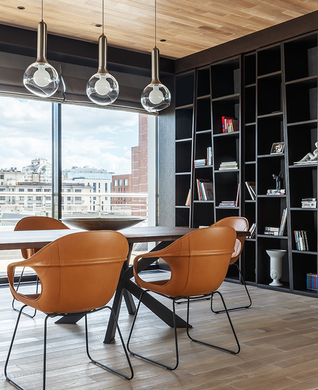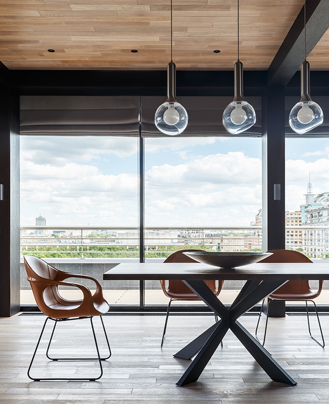 Изначальная полезная площадь была намного меньше теперешней: на крыше пустовала терраса около 100 кв. метров. «На ней мы построили павильон с панорамными окнами, в котором разместили столовую, — рассказывает Тимур Шарипов. — Таким образом площадь общественной половины увеличили на 60 кв. метров. Павильоном мы особенно гордимся: согласовали его с большим трудом, зато оттуда открывается великолепный панорамный вид на город, который придает квартире дух настоящего пентхауса».