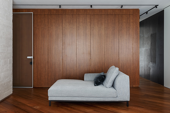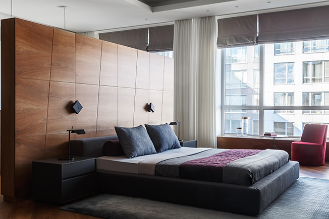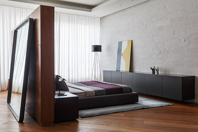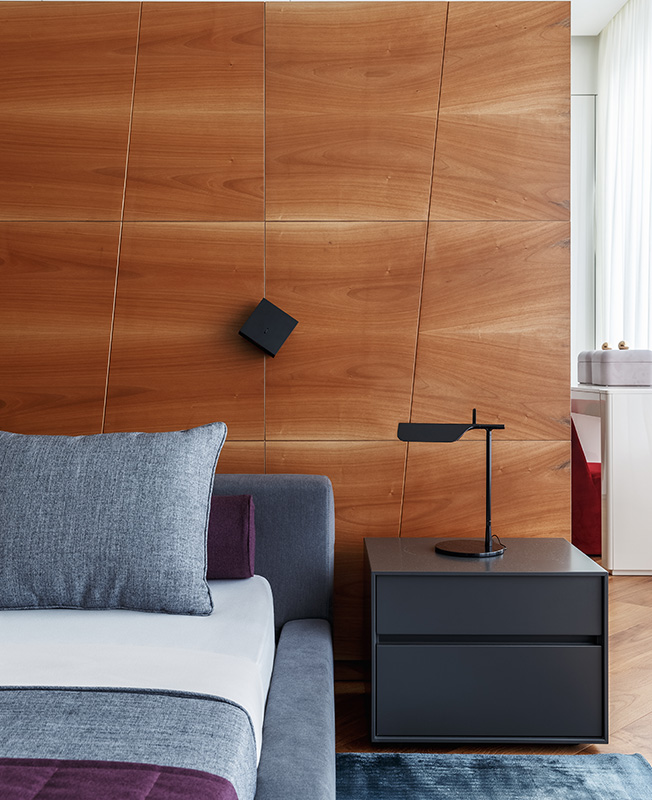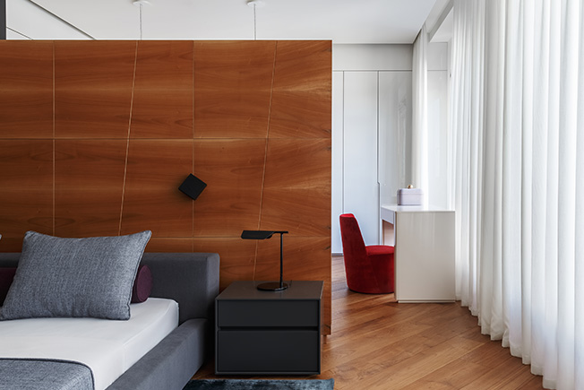 Cпальня хозяев. Кровать Desire. Тумба Presotto. Кресло Casamilano. За перегородкой — гардеробная. Деревянные панели изготовила фабрика FMF.