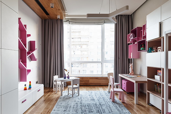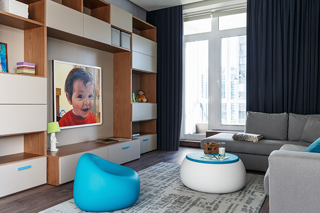 Игровая комната может выполнять функцию гостевой спальни. Диван Ditre. Корпусная мебель изготовлена на заказ компанией Olivieri. Пуф и столик со съмной столешницей Plust.