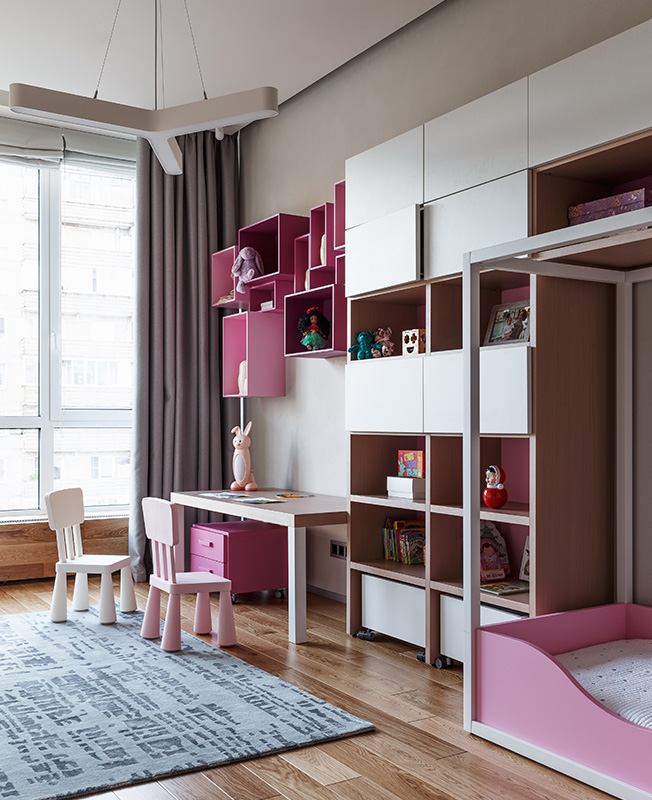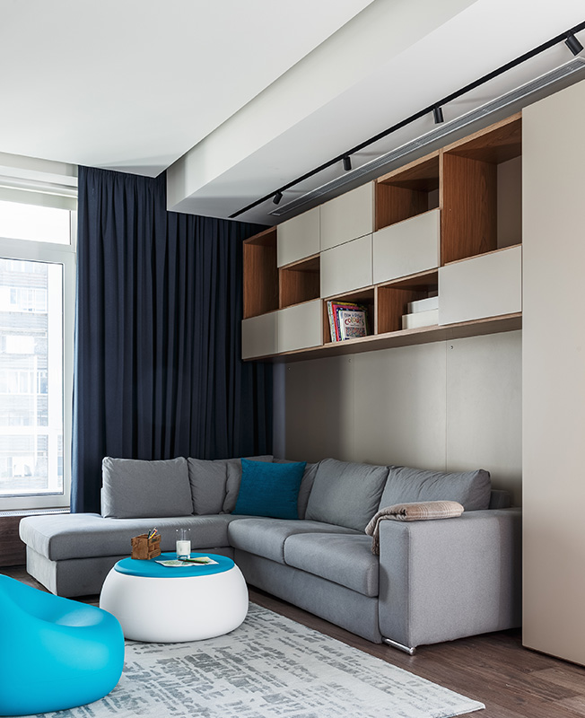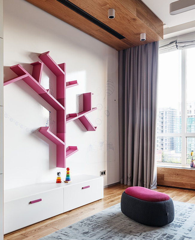 Гостевая спальня, она же игровая комната. Диван Ditre. Корпусная мебель изготовлена на заказ компанией Olivieri. Пуф и столик со съмной столешницей Plust.