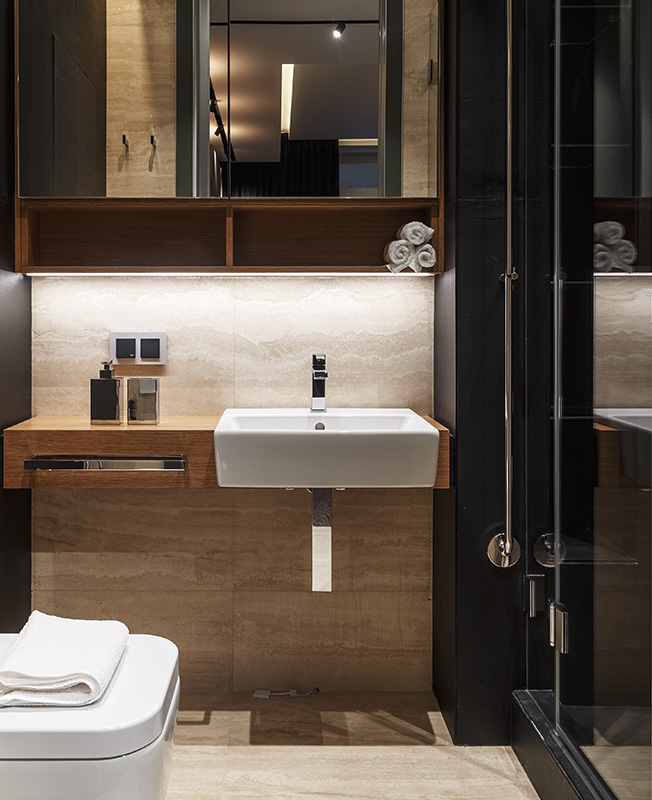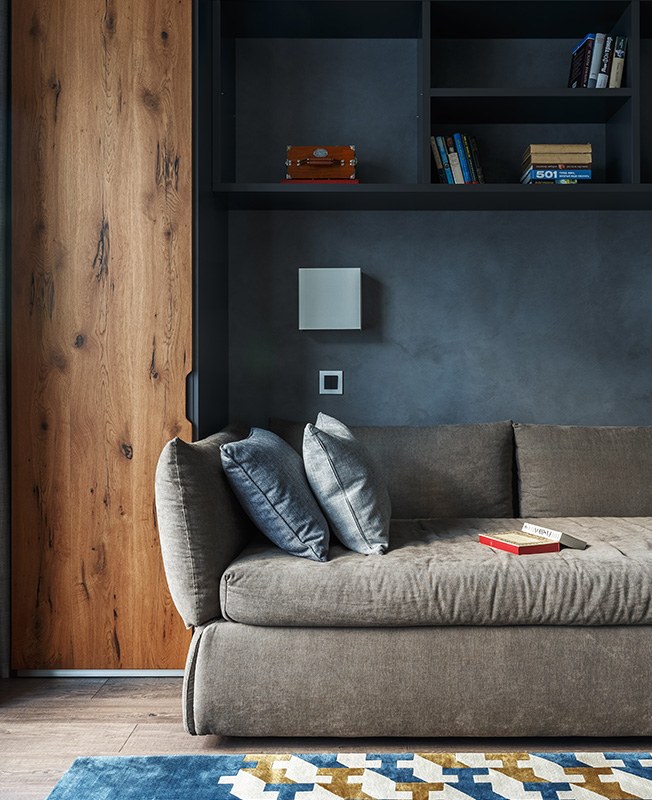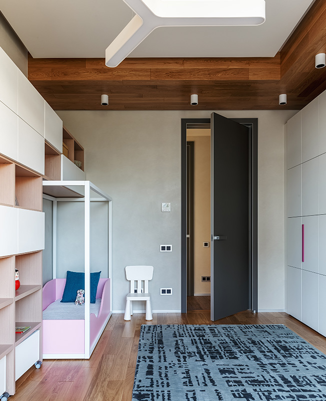 Натуральные материалы определили палитру. Разнообразые оттенки дерева, камня, штукатурки, кожи образуют отнюдь не скучное полотно нейтральных тонов. Синие акценты появляются в зоне кухни и в детском санузле, в детской — розовые, бирюзовые детали — в игровой.