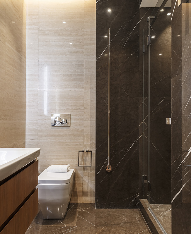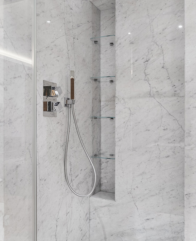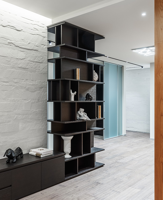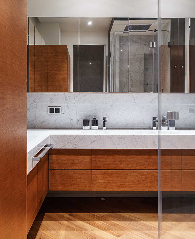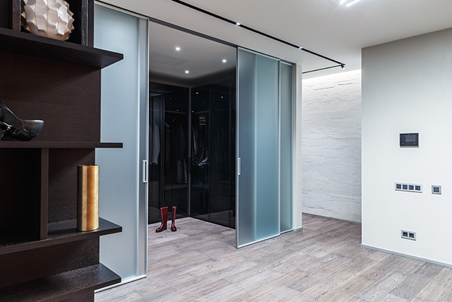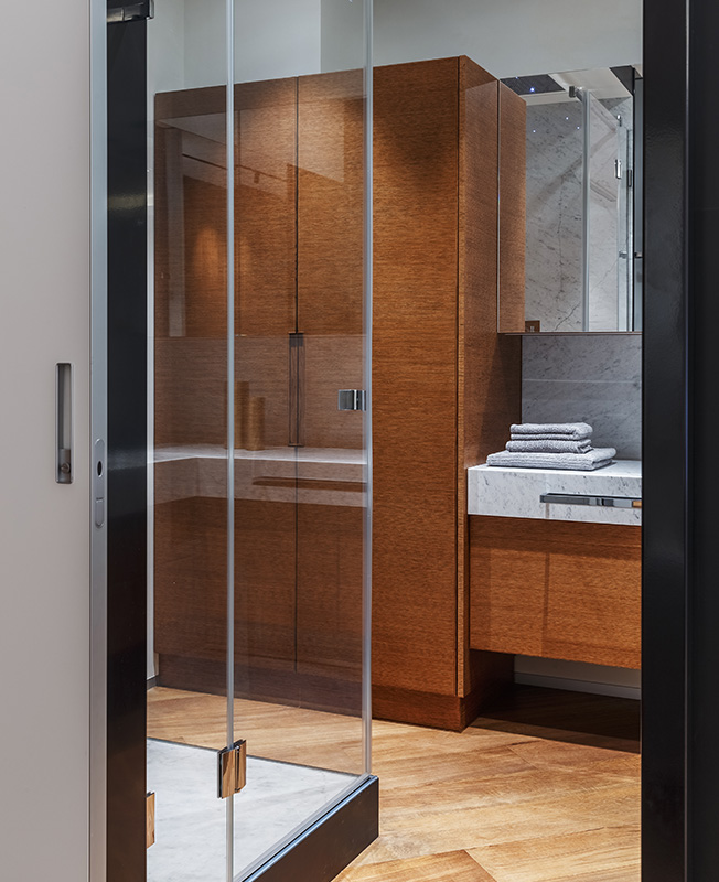 «Ядро» квартиры отделано декоративной штукатуркой, за стеклянными перегородками находится гардеробная.