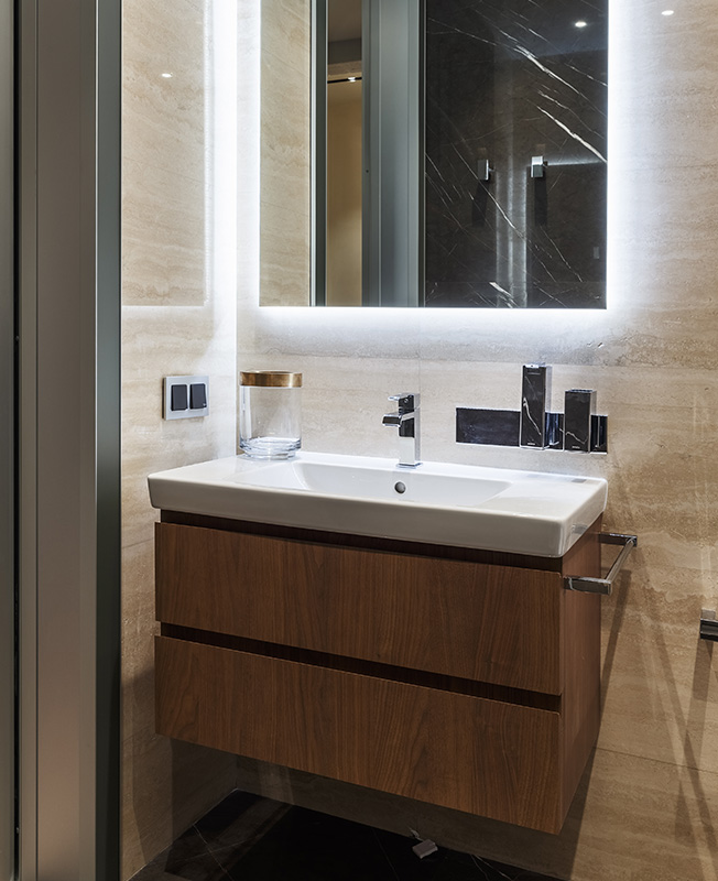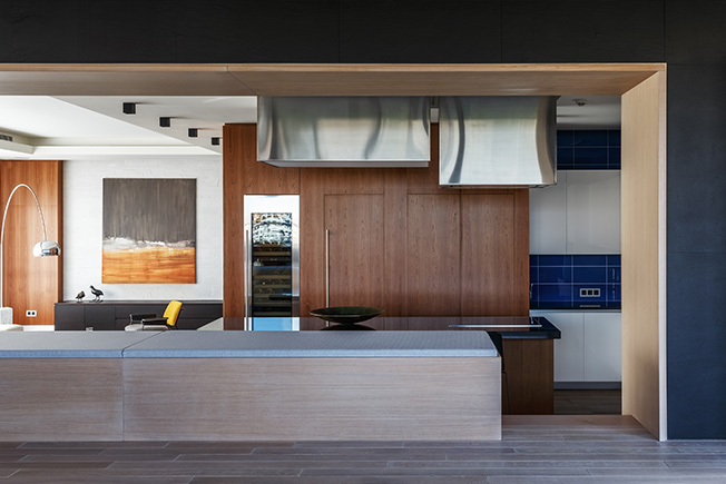 Над кухонным островом два «куба» из стали, один из них вытяжка, другой — светильник. Все решетки воздуховодов спрятаны в ниши и кессоны. Подоконники выполнены в виде коробов-сидений, скрывающих радиаторы. В напольное покрытие на открытой террасе встроена подсветка.