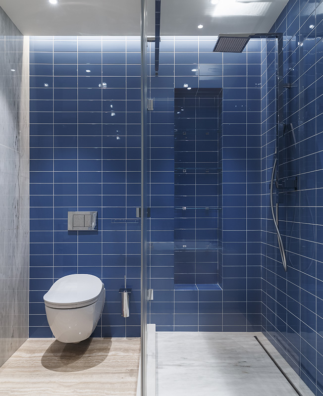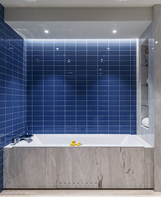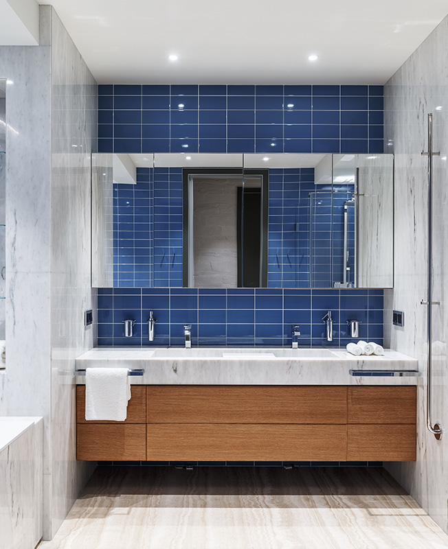 В зоне кухне появляется цвет — архитекторы выбрали синюю плитку для отделки. Кухня Cesar.
