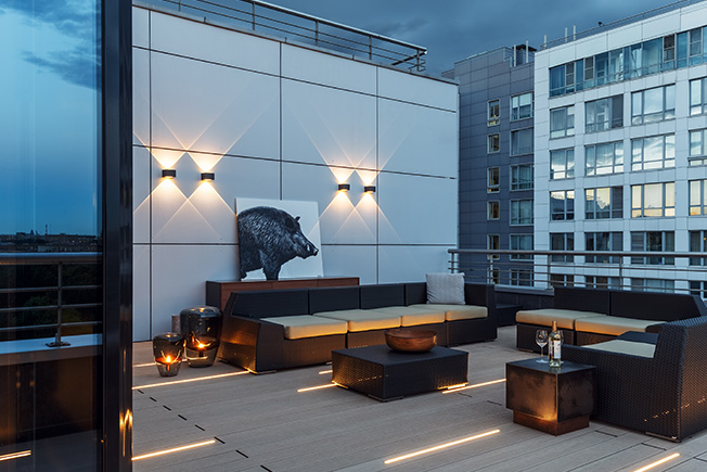 На террасе установили модульную мебель Atmosphera. Настенные светильники Delta Light.