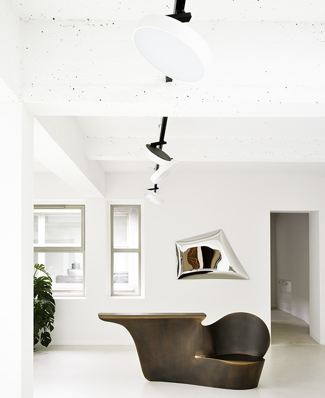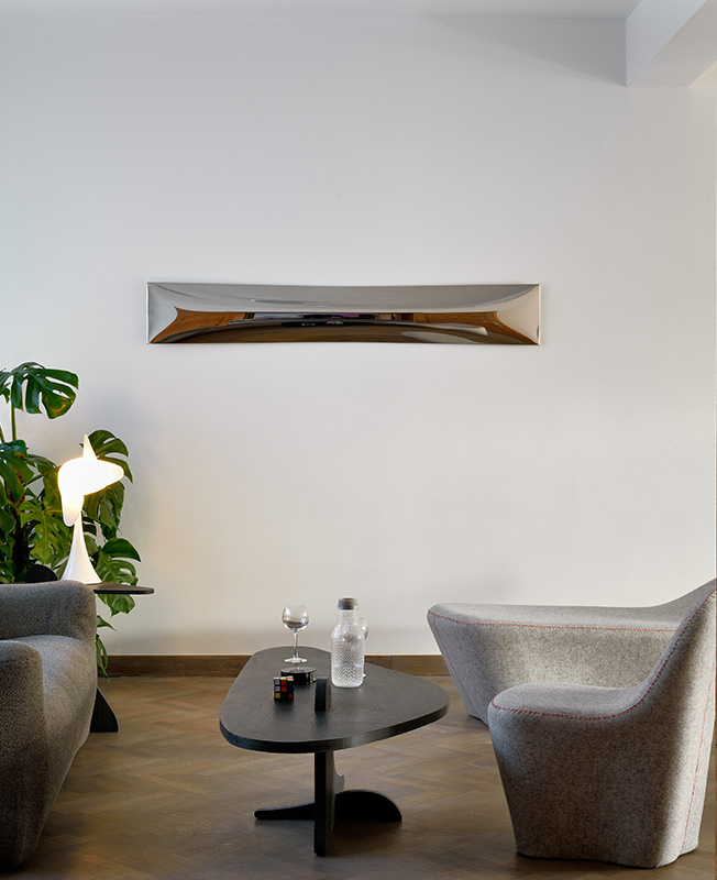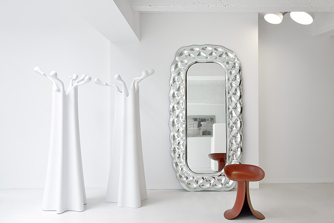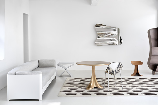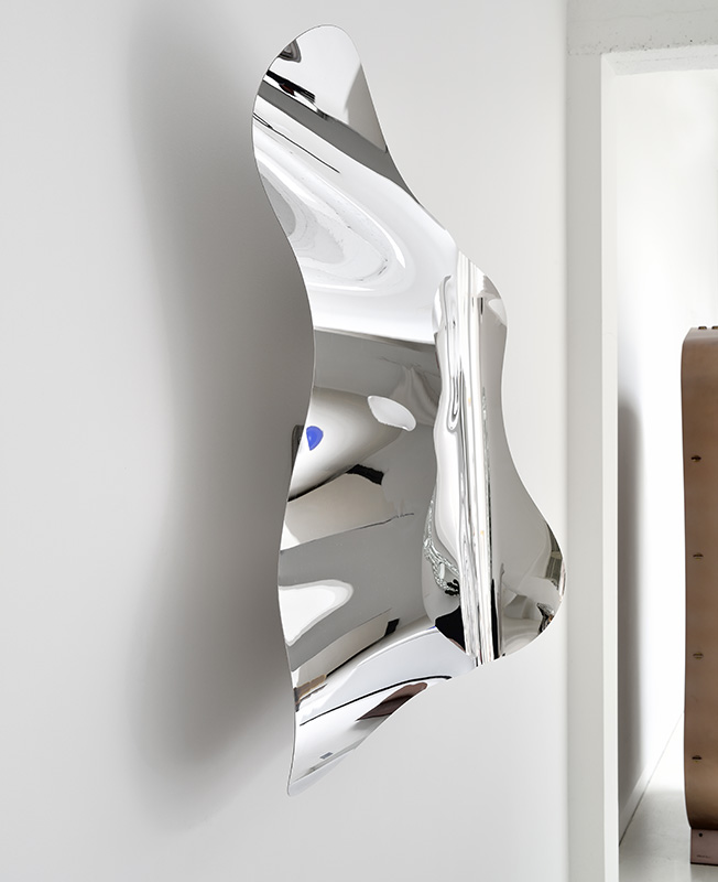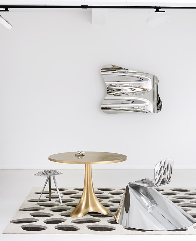 Объект Oudjat — гибрид сиденья и консоли, выполнен из полированной и сатинированной латуни. 12 экз. На стене зеркало Blob IV. Нержавеющая сталь в зеркальной полировке. 20 экз.
