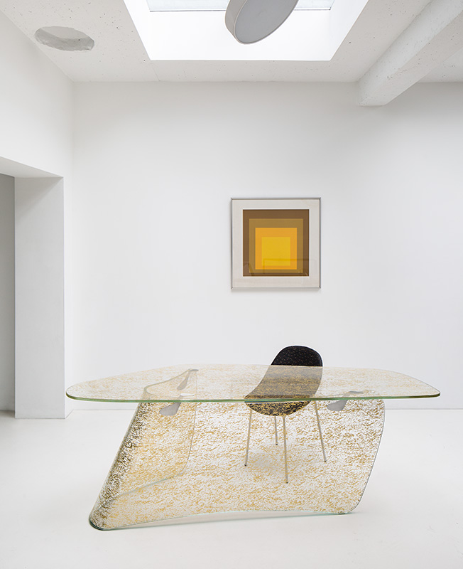 Cтол Gold Graph. Сверхпрозрачное стекло, золото 24 карата. 12 экз. Стул Cone для A Lot of Brasil. На стене работа Джозефа Альберса (1888–1976). Американский художник немецкого происхождения — одна из ключевых фигур геометрической абстракции.