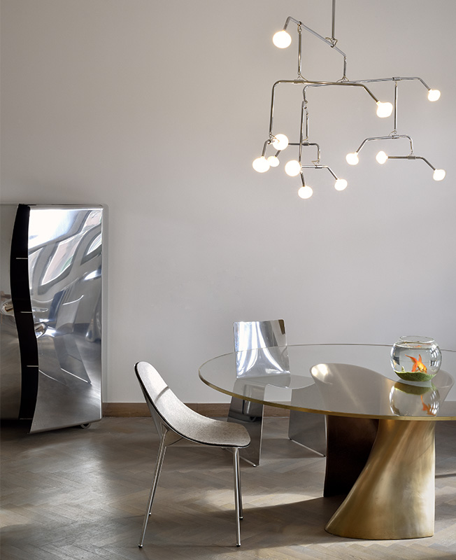 Семейная столовая. Люстра Fireworks для Driade вдохновлена творчеством А. Колдера. Стол S-table с основанием из бронзы. 20 экз. «Очень эмоциональная вещь», — говорит о ней автор.