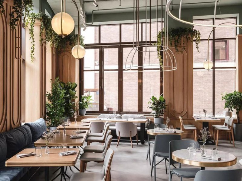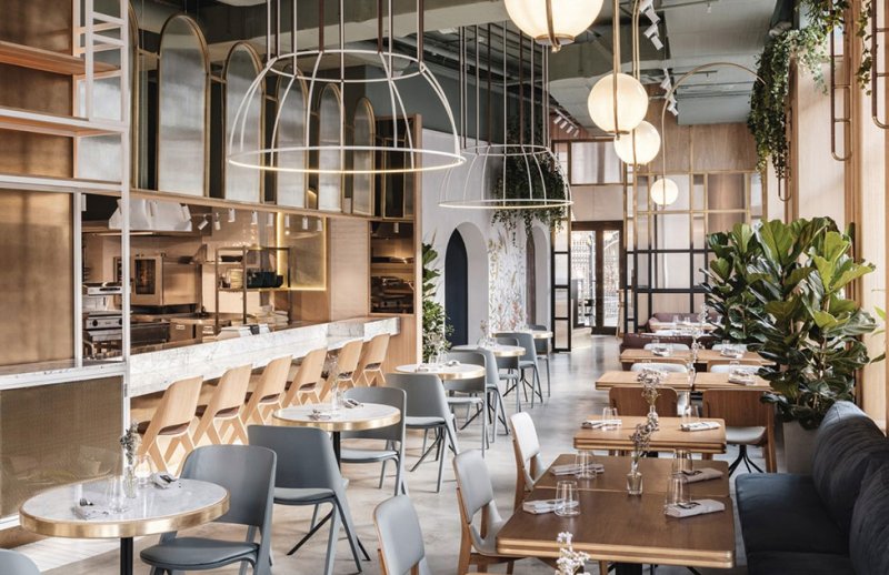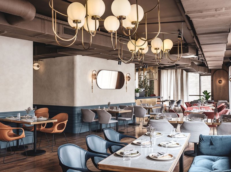 Единообразие создается за счет повторяющихся эффектных элементов — деревянные панели увиты растениями, потолок украшают масштабные куполообразные или наоборот весьма сдержанные светильники, повсеместно царствует окрашенный металл и венчает образ, конечно же, приглушенная цветовая палитра. За основу дизайнеры взяли бледно-голубой, пыльный розовый и спокойный мятный оттенки.