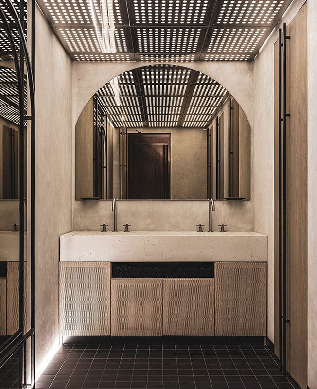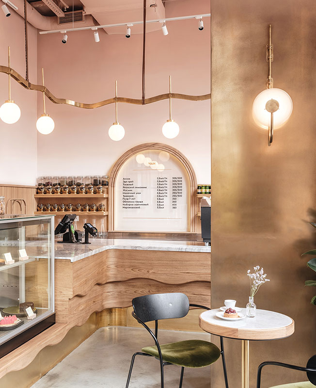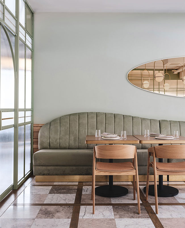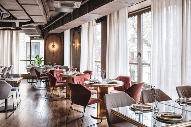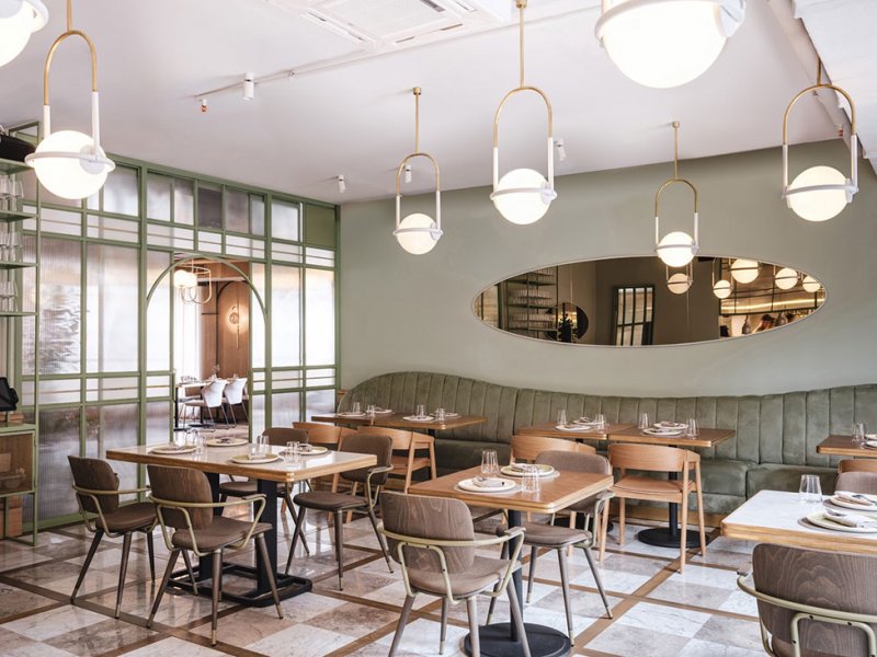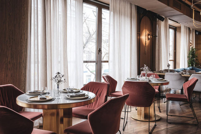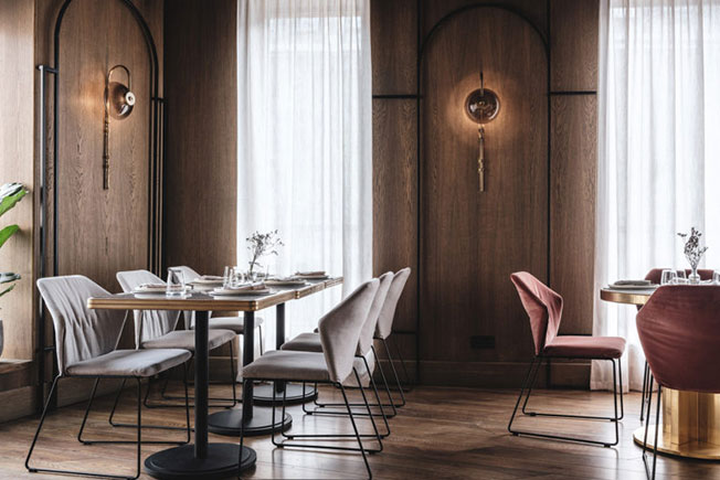 Пространство разворачивается с камерного зала на первом этаже, в котором мятные оттенки, латунь и полупрозрачные стеклянные перегородки напоминают оранжерею в европейском саду. Все последующие помещения одновременно перекликаются и контрастируют друг с другом. Покрытые бархатом диванчики и кресла сочетаются с деревянными стульями и мраморными столиками.