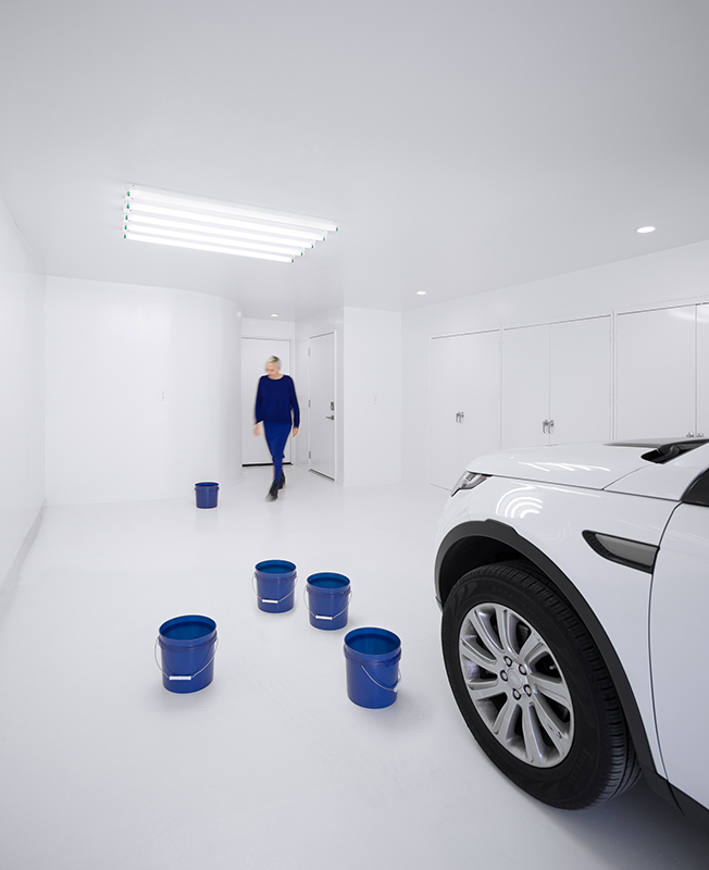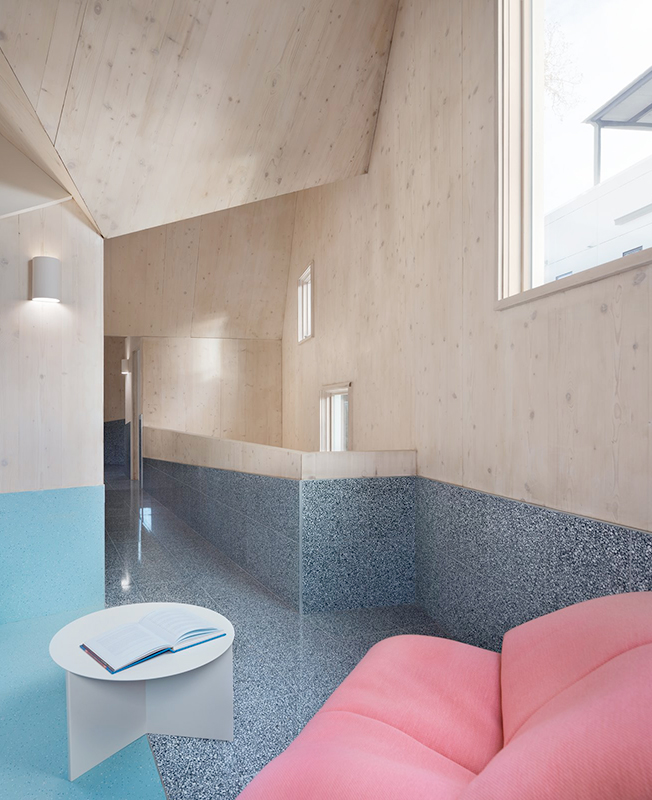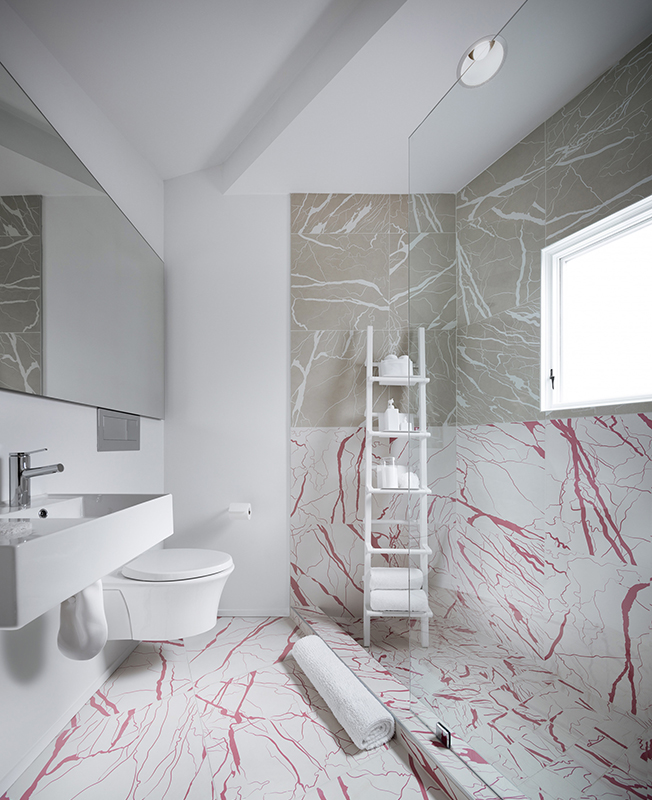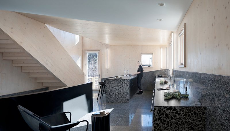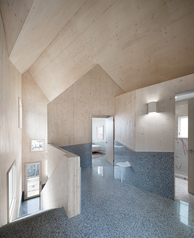 Внутри черное терраццо — не заливной отполированный пол, а тонкая плитка с соответствующим узором. Вместо ориентированно-стружечной плиты (OSB) использована керамическая плитка, имитирующая ее. То же с «мраморными» поверхностями в спальне и смежной с ней ванной. Эти искусственные покрытия уложены так, словно зонируют пространство, тогда как в действительности они не соответствуют фактическим границам ни одной из комнат.