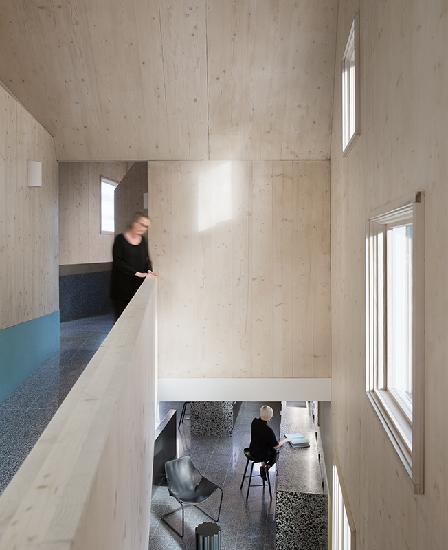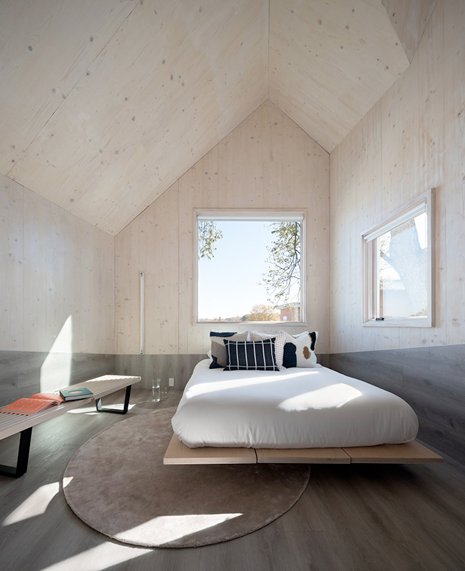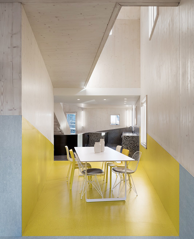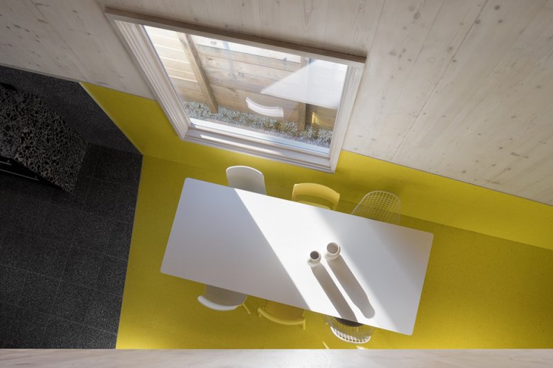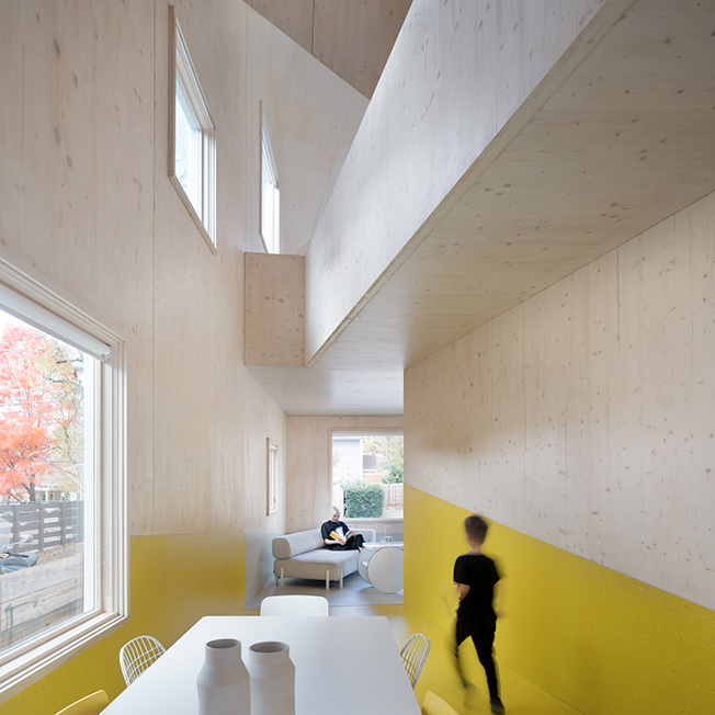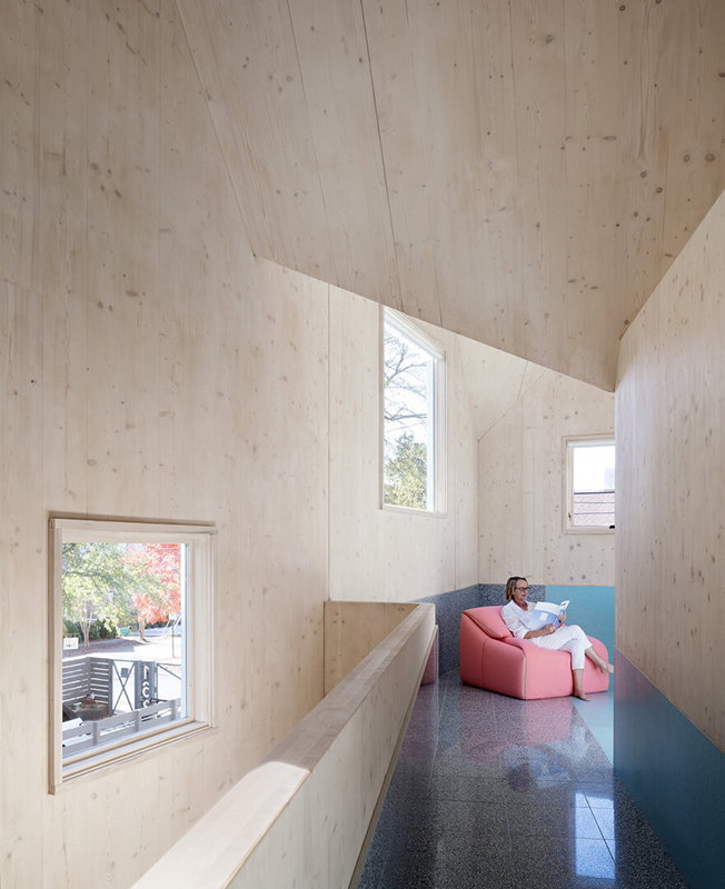 Это одна из немногих в США резиденций, построенных из кросс-ламинированной древесины (CLT). Панели из склеенных и спрессованных слоев досок, каждый из которых уложен поперек предыдущего, получаются достаточно прочными, чтобы их можно было использовать для возведения зданий. Haus Gables был построен за заказ, привезен на место и собран за 14 дней. Панели CLT, использованные как строительный материал, гармонично выглядят и в интерьере, обеспечивая зданию цельный образ. Светлые деревянные поверхности архитектор разбавила яркими красками, использовав прием Color Blocking, который помог зонировать пространство.