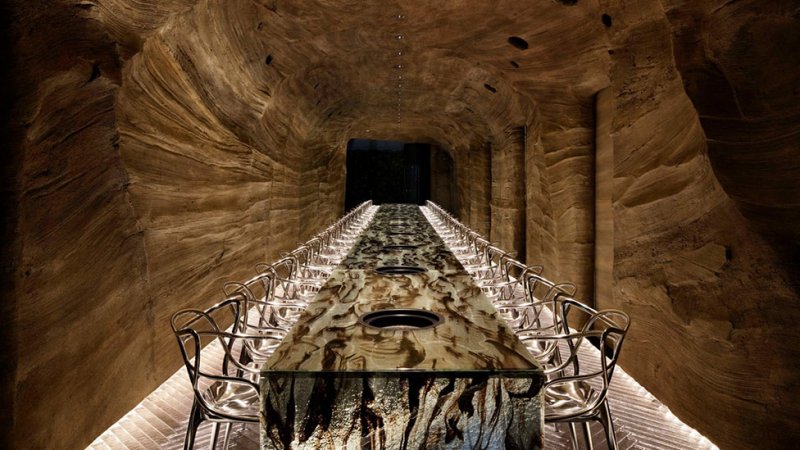 Слабое освещение, грубые стены с эффектом натурального камня и стеклянные полы помогают создать в этом токийском ресторане атмосферу первобытной пещеры.