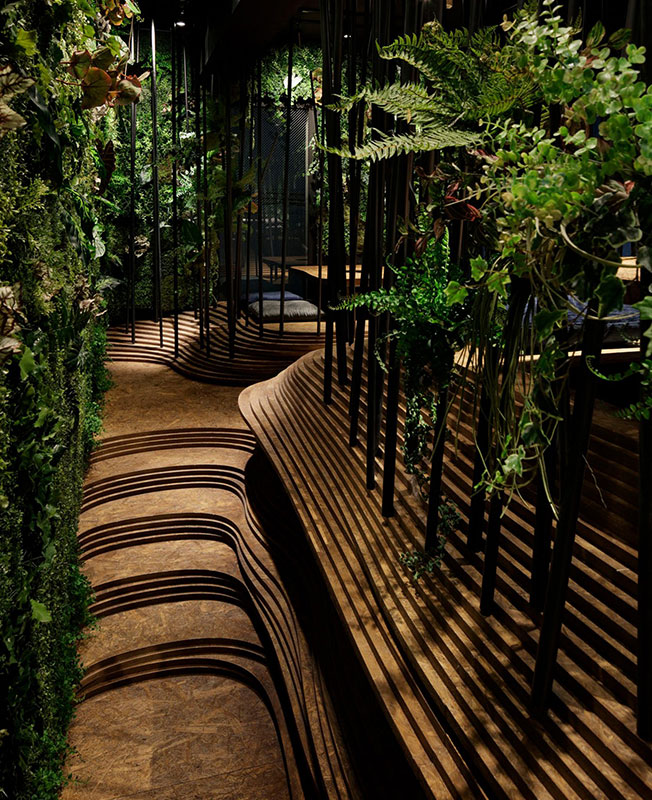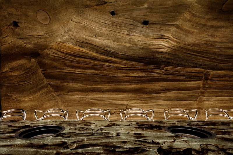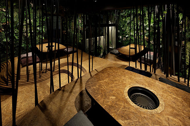 Слабое освещение, грубые стены с эффектом натурального камня и стеклянные полы помогают создать в этом токийском ресторане атмосферу первобытной пещеры. Расположенный в оживленном районе Роппонги, ресторан Nikunotoriko был спроектирован местным архитектором Рёдзи Иедокоро (Ryoji Iedokoro). Новое заведение предлагает альтернативный подход к якинику — японскому стилю, когда клиенты готовят мясо над маленькой жаровней за своим столом. Иедокоро решил создать сюрреалистический, похожий на пещеру интерьер. В главной столовой, расположенной на первом этаже, стены выполнены в виде скалистых поверхностей. Полупрозрачные плитки выложены елочкой на полу, чтобы имитировать образ текущей воды. Стеклянный стол длиной 6,5 метра в центре комнаты украшен тонкими мазками коричневой краски, которые напоминают клубы дыма. Прямо под ним находится неглубокий желоб из гравия, предназначенный для того, чтобы посетители чувствовали, что они «сидят у реки». Вокруг стола расставлены стулья Masters, дизайн Филиппа Старка для Kartell. Освещение — всего несколько светильников, встроенных в потолок. На втором этаже создана серия обеденных пространств, зонированных волнистыми панелями OSB с выразительным древесины. Гости сидят на простых подушках на полу. «Поскольку все столы находятся на разных уровнях, это позволяет вам уединиться со своими близкими так, чтобы обед более приятным и незабываемым», — говорит Иедокоро.
