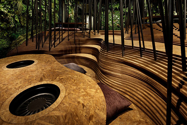 Освещение — всего несколько светильников, встроенных в потолок. На втором этаже создана серия обеденных пространств, зонированных волнистыми панелями OSB с выразительным древесины. Гости сидят на простых подушках на полу.