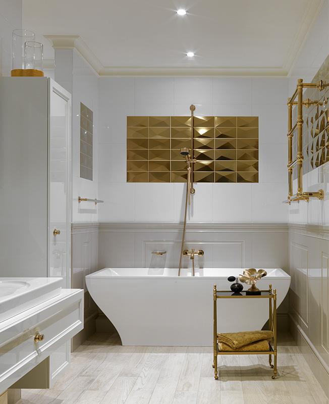 В ванной использовано оборудование брендов Villeroy & Boch, Nicolazzi, Huppe, Caia, Gessi, Tece, Toto. Декор: Arca Horn и l'Objet, шоу-рум Deluxe Home Creation.