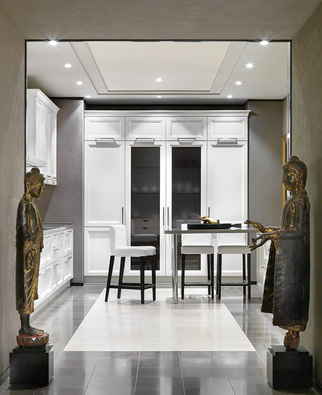 Широкий коридор-галерея перетекает в кухню. Мебель Castagna Cucine. На столешнице скульптурные доски Uтварь collection, Made in August, дизайнер Виталий Жуйков. Cлева фигура Будды. Дерево, лак, стекло, позолота. Бирма. XIX в.