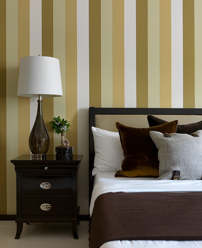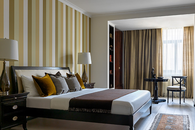 Спальня. Декор стены выполнен с помощью краски Little Greene. Кровать и прикроватные тумбочки Galimberti Nino. Настольные лампы Andrew Martin. Подушки de Le Cuona, плед Loro Piana, всё — шоу-рум Deluxe Home Creation.