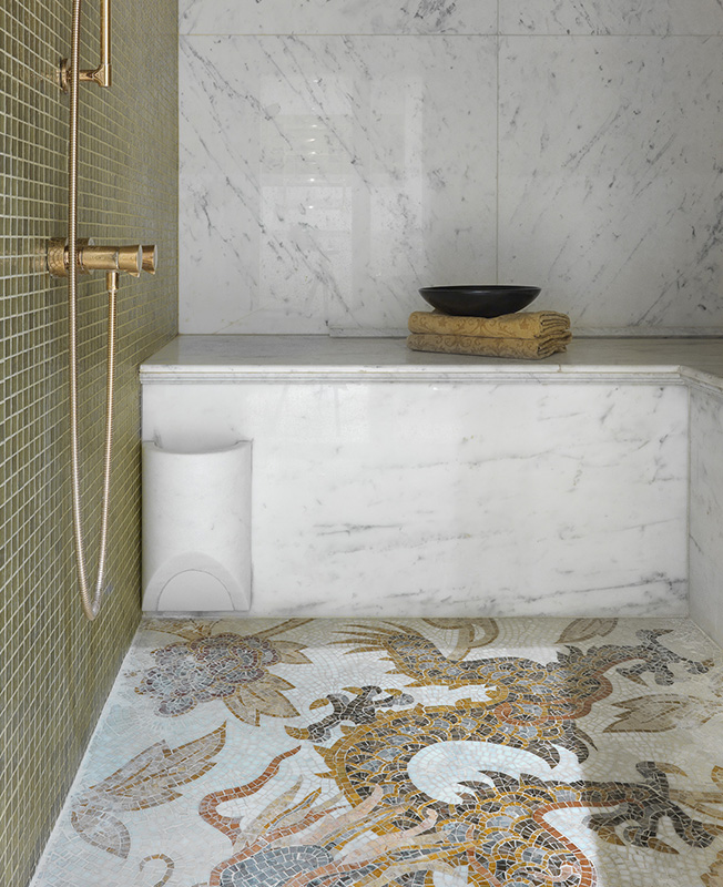 В квартире обустроен хамам, в него можно попасть из главной ванной. Мозаичное панно на полу выполнено частным мастером.