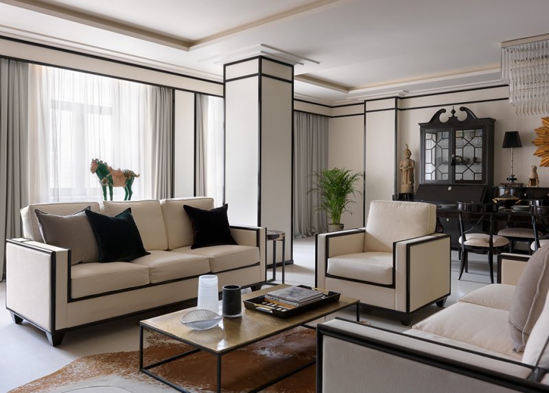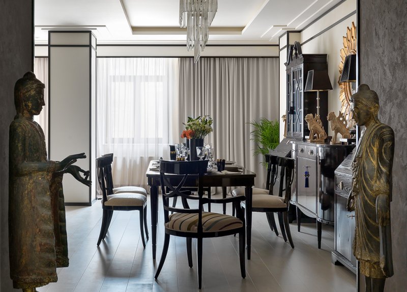 Гостиная-столовая. На постаментах симметрично разместили парные фигуры воинов. Терракота, роспись. Китай, династия Северная Вей. VI в. Стол и стулья, корпусная мебель — всё от компании Galimberti Nino. Зеркало F.A.L., люстра Mariner.