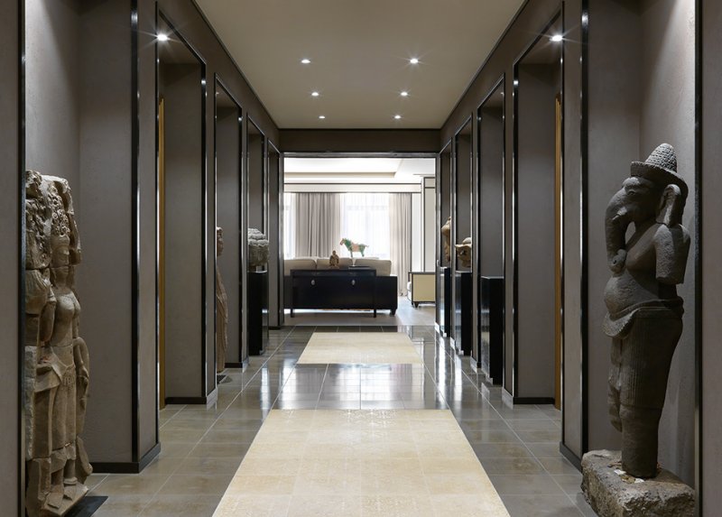 Коридор превращен в подобие галереи. Слева стела с изображением апсары, песчаник, XII–XIII вв. Камбоджа, Ангкорский период. Справа статуя Ганеши, песчаник, XII—XIII вв. Камбоджа, Ангкорский период. Декоративная штукатурка: «Мастерская Марата Ка».