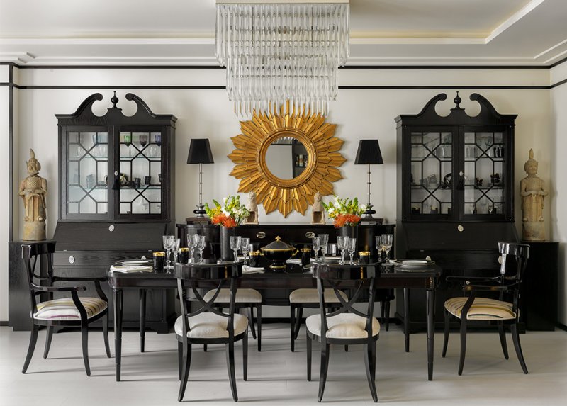 Коридор-галерея приводит в гостиную-столовую. Корпусная мебель, стол и стулья — всё от фабрики Galimberti Nino. Cправа фигура Будды. Дерево, лак, стекло, позолота. Бирма, XIX в.