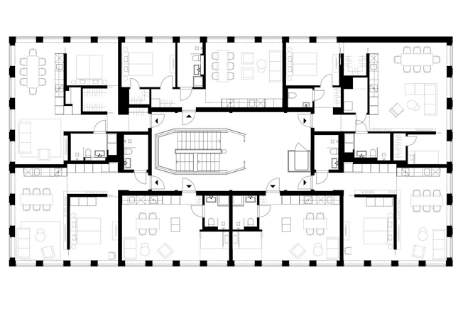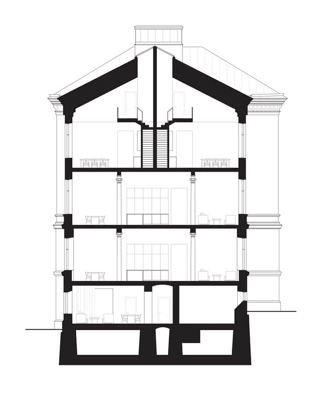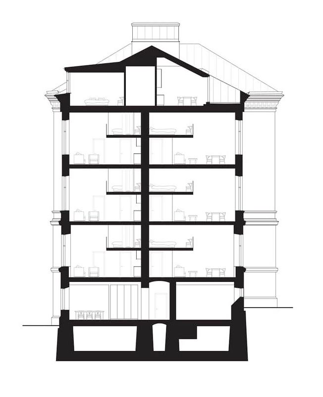 Помимо интерьером квартир студия отреставрировала и общественные зоны. Чтобы воссоздать облик фойе и лестниц, заказали известняк из того же карьера, который использовался первоначально. Существующие колонны и фасад были перекрашены, а во внутреннем дворе разбит сквер.