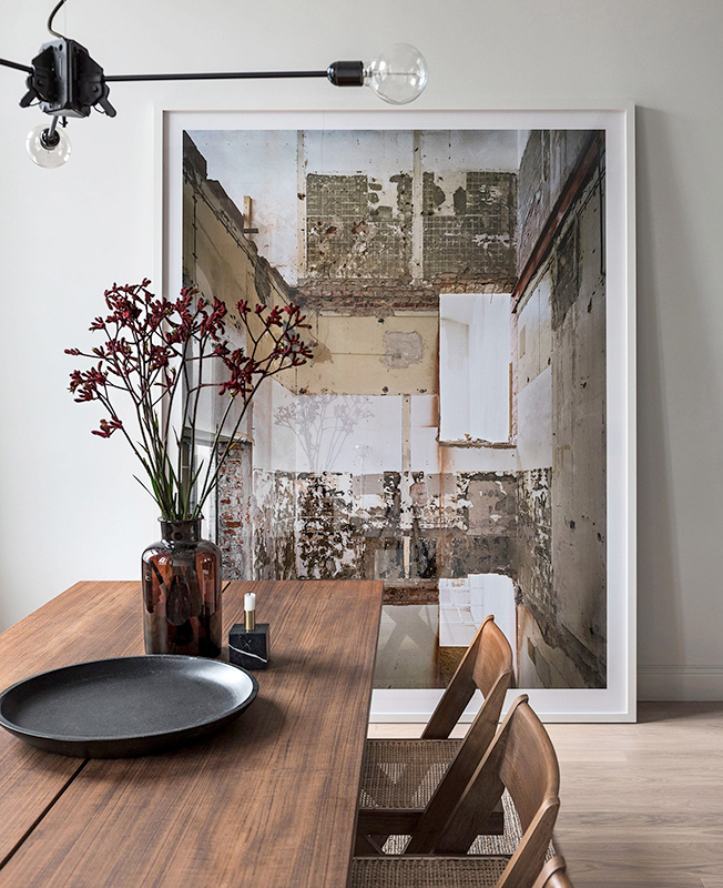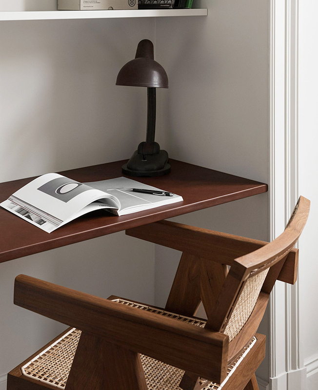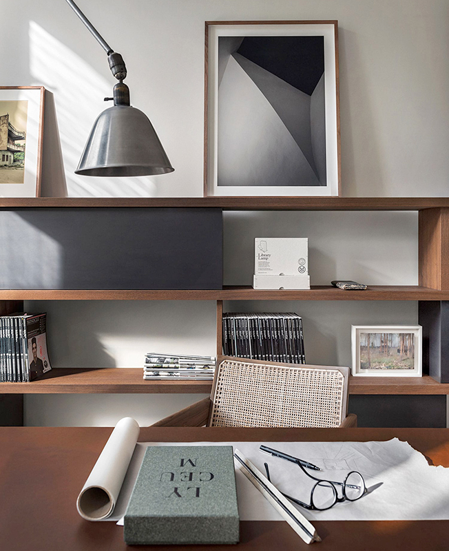 В восстановленных стенных нишах, изначально построенных для книжных полок, сейчас разместились деревянные стеллажи и письменные столы. Шкафы для хранения на кухне напоминают вытяжные шкафы, используемые для научных экспериментов, а форма кухонного острова с мраморной столешницей, дополненного табуретами по дизайну Пьера Жаннере, отсылает к лабораторному столу.