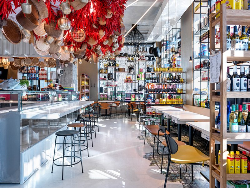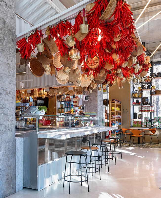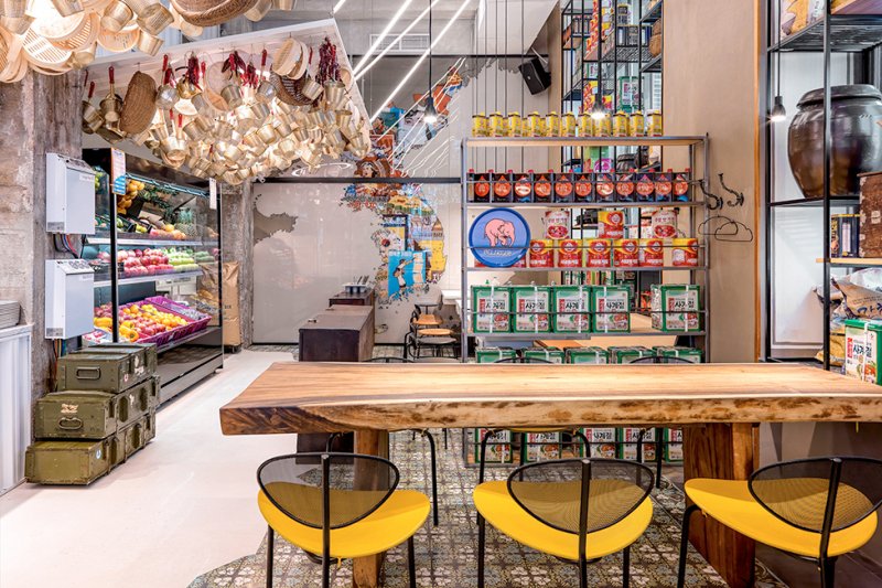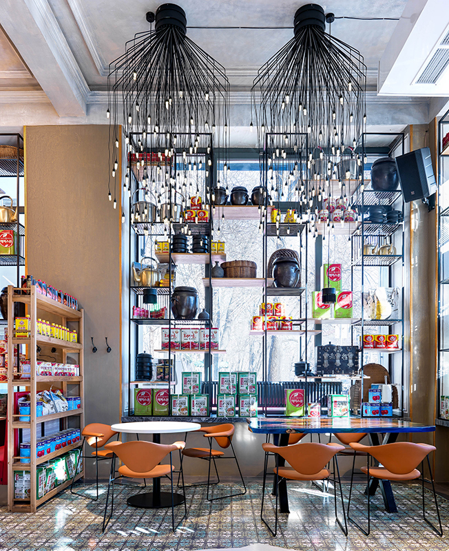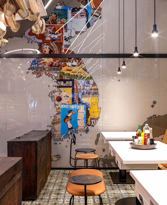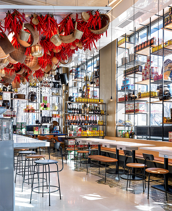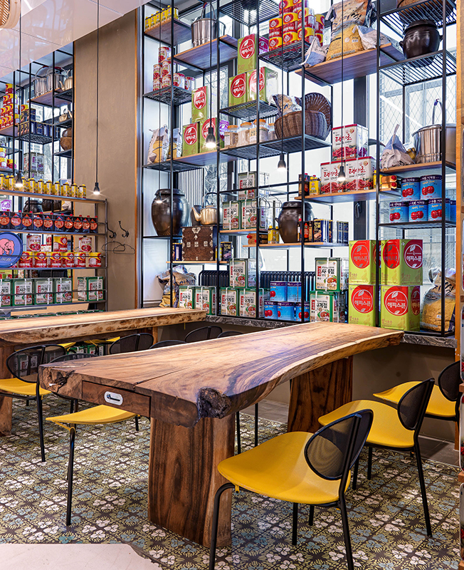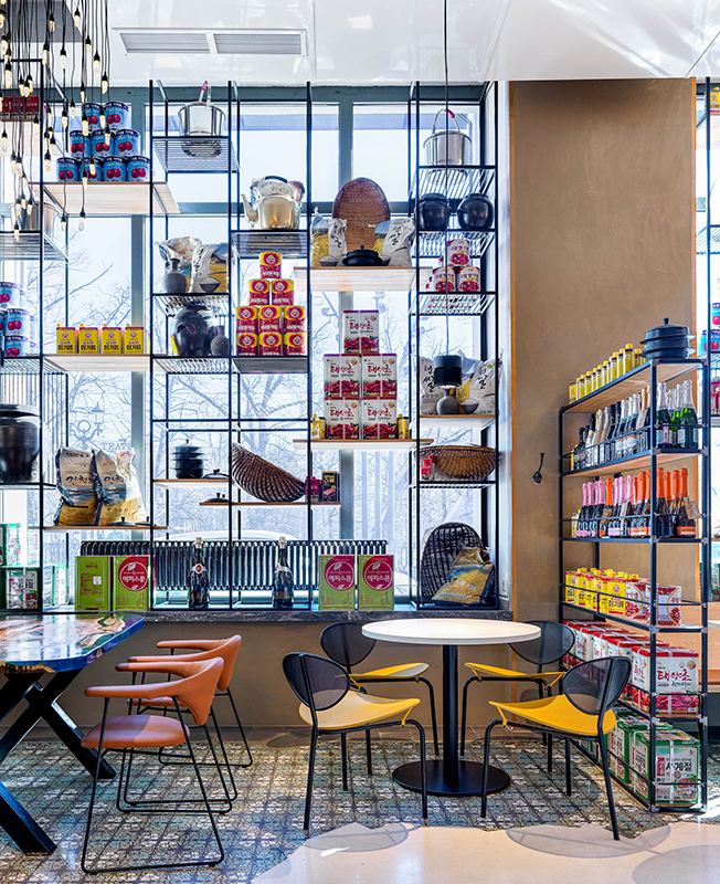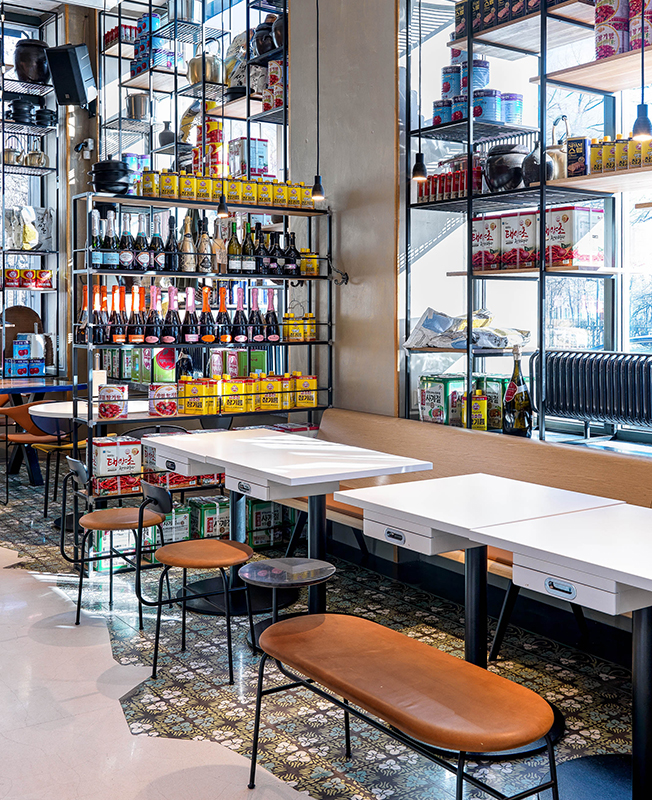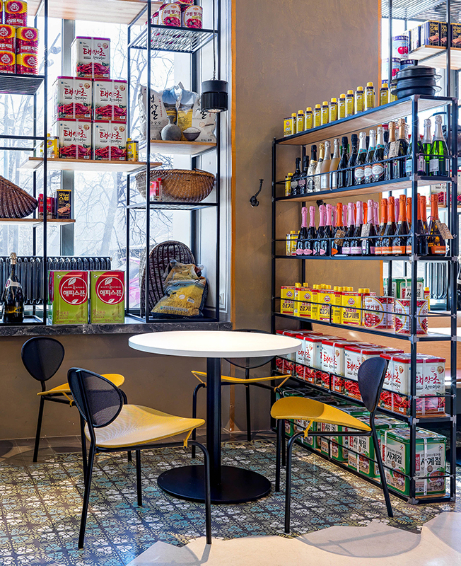 Места для гостей расположили возле окон, друг от друга их отделяют стеллажи, заполненные ровными рядами продуктов и кухонной утварью, которую заказали для этого проекта в Южной Корее. «Было интересно выбирать в прямом эфире по WhatsApp и заказывать весь декор из Кореи... Нужно было представить, какие предметы, какого размера и сколько встанут на наши многочисленные стеллажи. Когда в Москву приехал огромный контейнер, я испугалась, что переборщила с количеством и половина декора останется невостребованной».