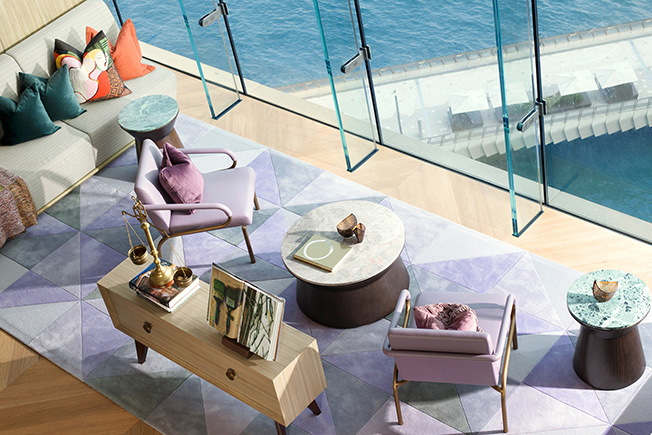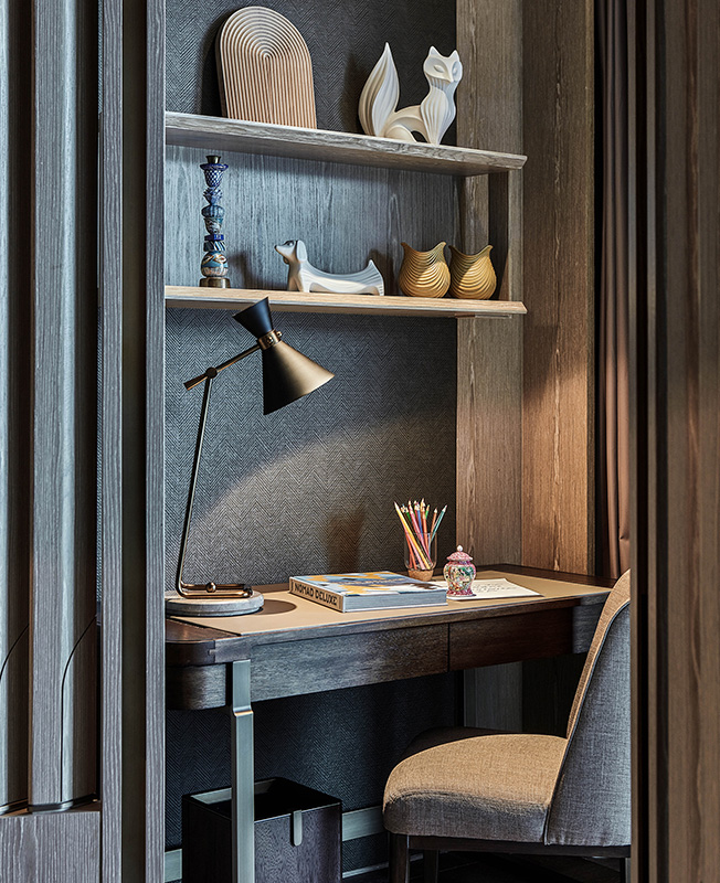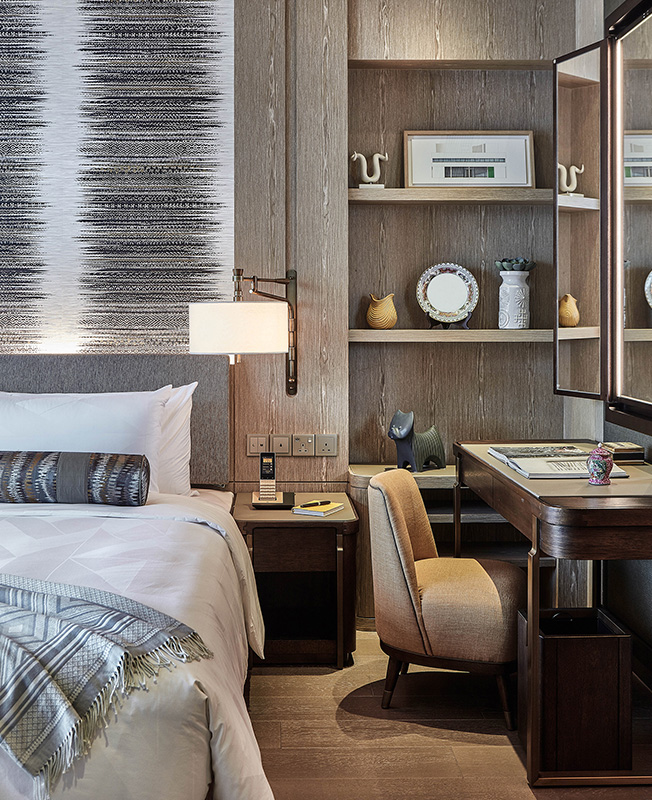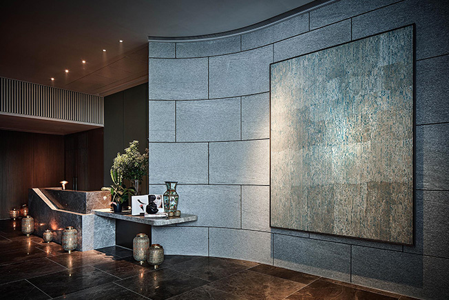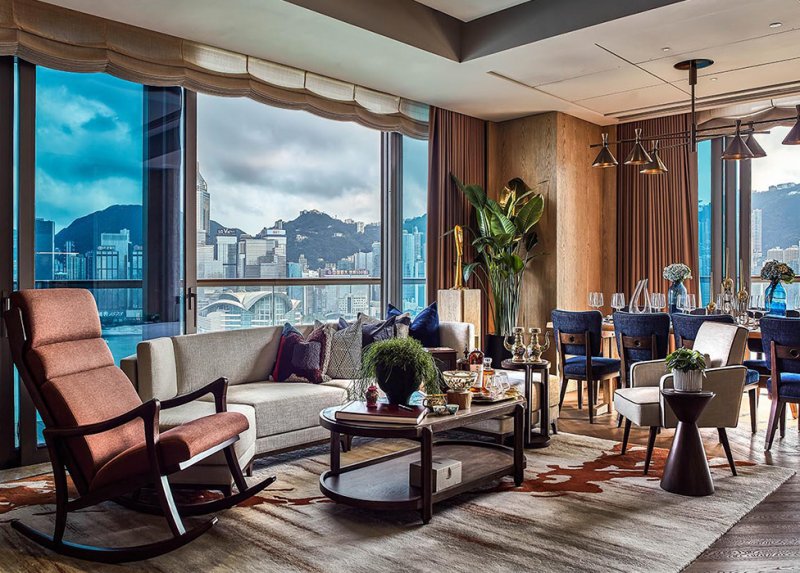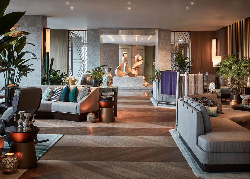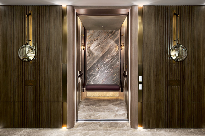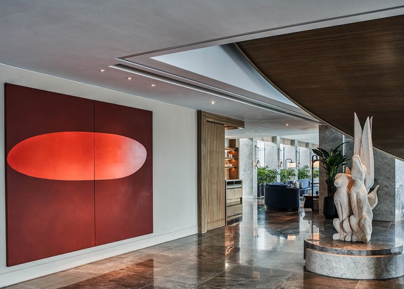 Фу воплощает традиционный комфорт и современный стиль, спроектировав интерьеры с изготовленными на заказ бархатными креслами, элегантными дубовыми и кожаными скамейками, лифтами, обитыми в текстиль розового оттенка, итальянским мрамором Perlato Royal... Впечатляющая экспозиция произведений искусства включает бронзовую скульптуру 2014 года британского художника Дэвида Нэша.