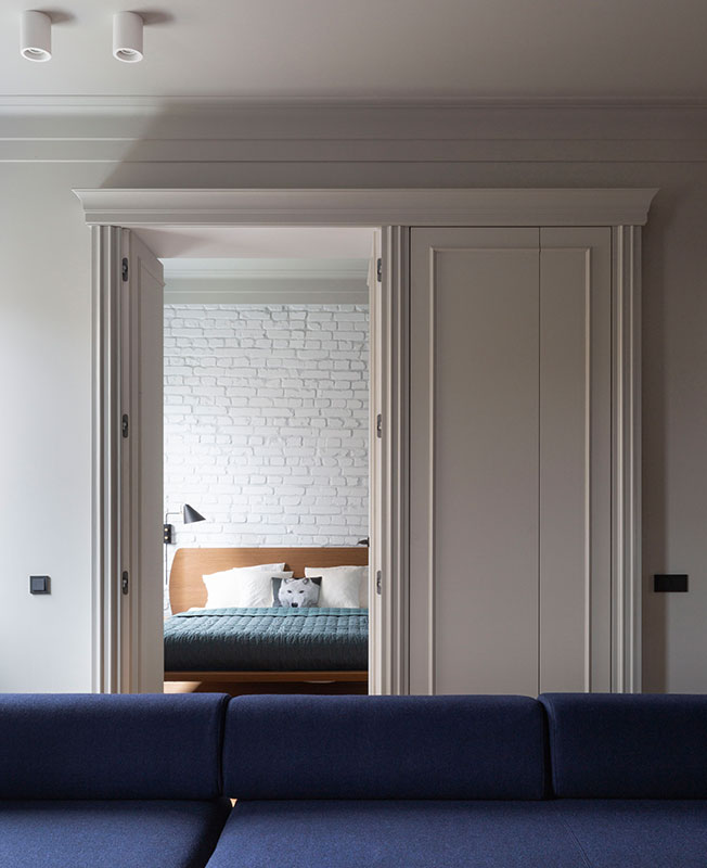 В отделке использовали натуральные экологичные материалы и природные оттенки. Основой палитры стал белый и серый цвет, дополненные контрастными вставками глубоких синих тонов. Колористическое решение разворачивается на фоне теплого оттенка пола из натурального дуба с необычной геометрией.