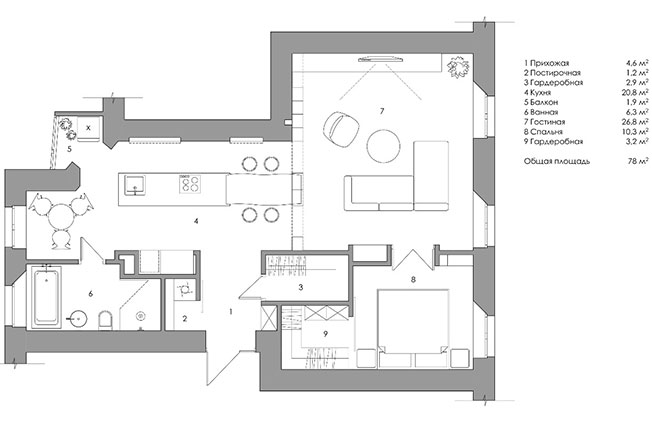 Владелец квартиры площалью 78 кв. метров на Проспекте Мира любит путешествовать и во время своих поездок по Европе предпочитает останавливаться в старых квартирах, будь то Лондон или Париж. В Москве молодой человек хотел иметь харизматичное жилье в старом фонде в духе современной эклектики. Оформлением интерьера занималась студия ZE|Workroom.