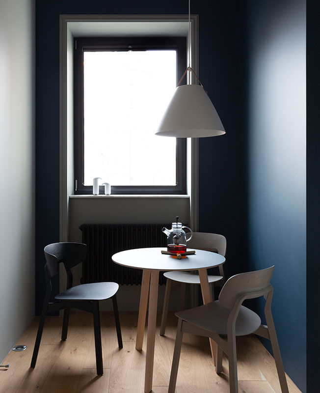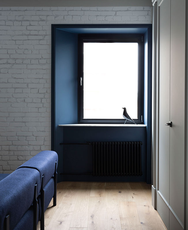 Так как окна изначально были небольшие, мы постарались максимально их раскрыть, чтобы добавить естественного света. Убрали лишние переплеты, выбрали узкий профиль рам и развернули откосы. Выкрасили их в глубокий синий цвет — акцентировали и сделали одной из главных тем квартиры».