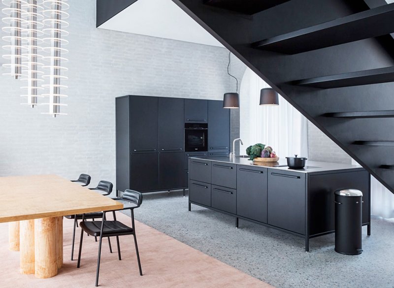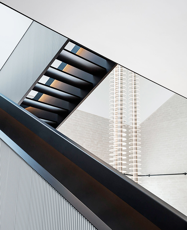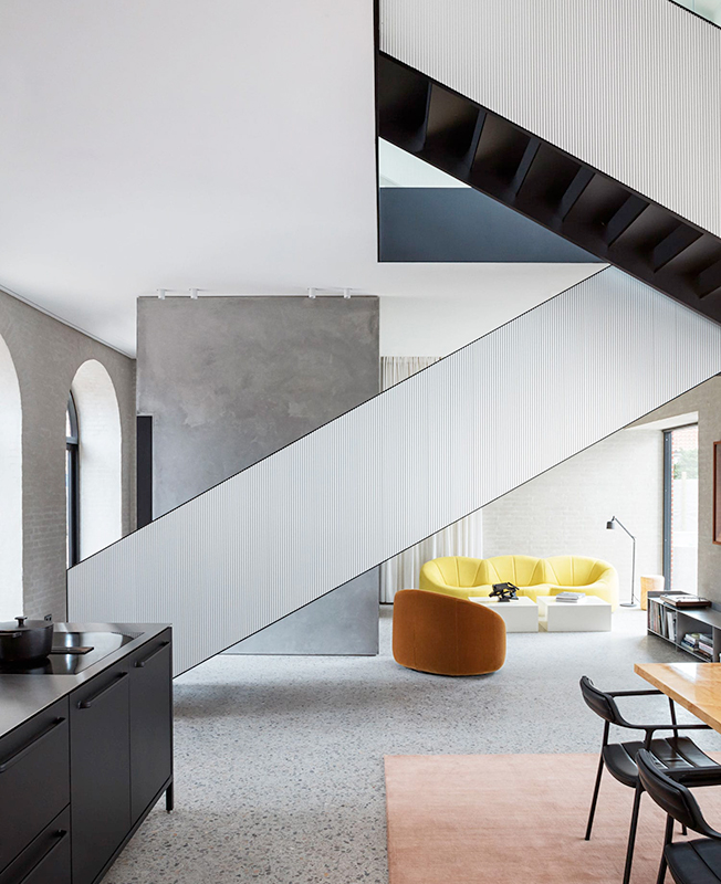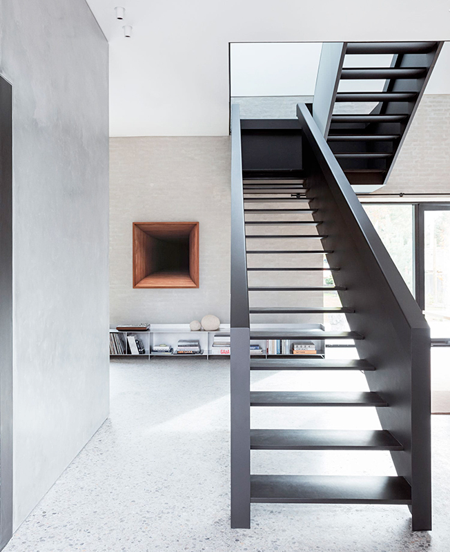 U-образная лестница, изготовленная на заказ, разделяет зоны гостиной и столовой. Ее отделка экструдированными алюминиевыми панелями перекликается с фасадом префаба Vipp Shelter в Швеции. Верхняя площадка залита естественным светом из большого окно в крыше, из которого видно трубу дымохода.