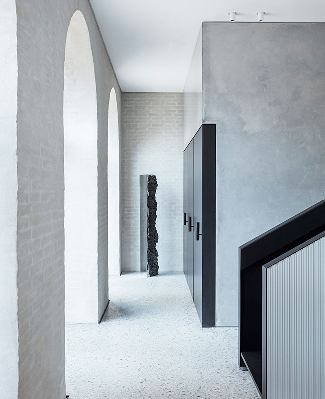 «Новый объем, в котором размещается ванная комната, отделен от стены — там есть декоративный паз, где пол с терраццо словно «останавливается». Склон оригинальной крыши выделен интенсивной линией и изменением материала, подчеркивающим ее расширение. Существующие фасадные стены обработаны теплой серой штукатуркой, чтобы выделить кирпич. Такой подход к детализации учитывает характер здания и определяет границы работ по обновлению», — говорит архитектор.